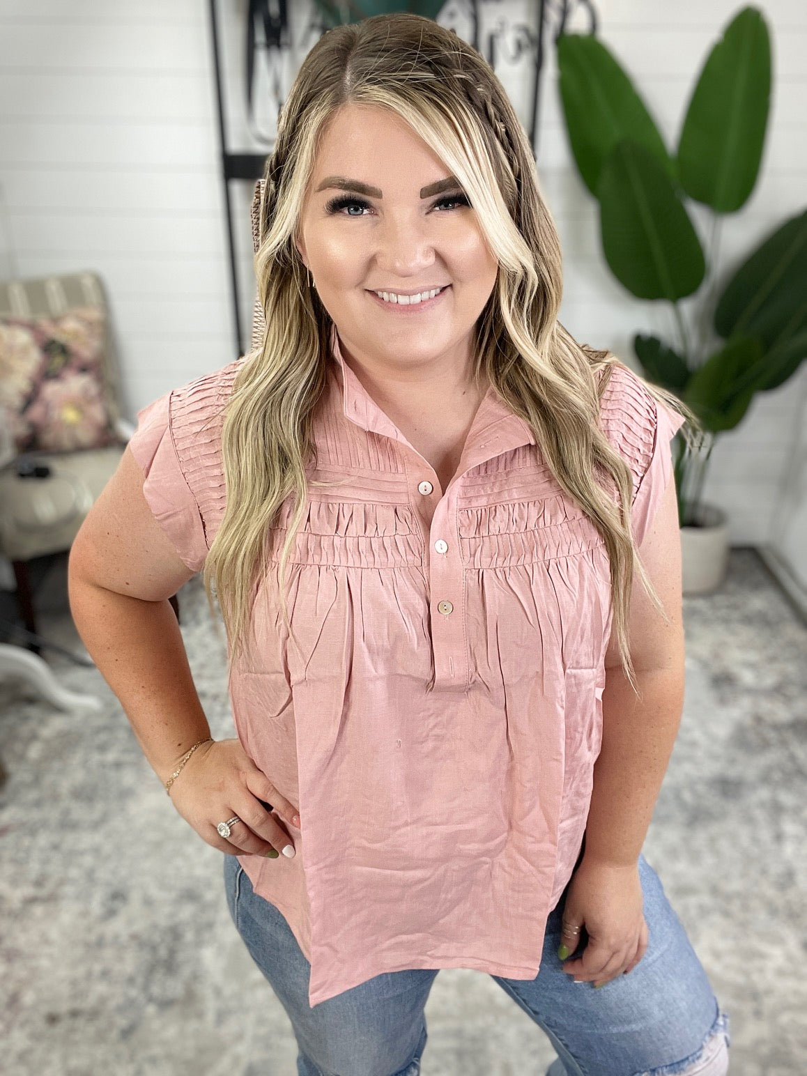Pleat Detail Button Up Blouse in Pink