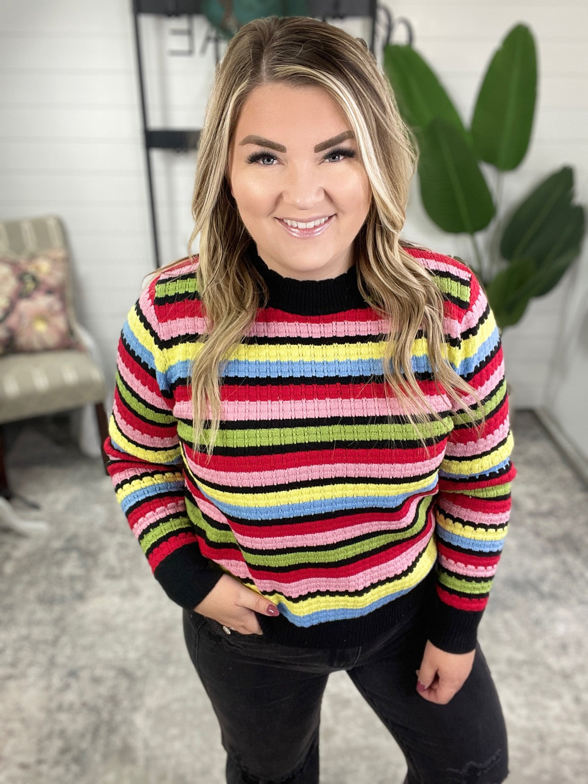This Keep Dreaming Striped Sweater is sure to become a wardrobe staple. Featuring a scalloped crew neckline, multi-colored stripe, and a super soft textured knit, this wardrobe must-have is also detailed with contrast ribbed hem and cuffs for a touch of style. Make a statement in cozy style.