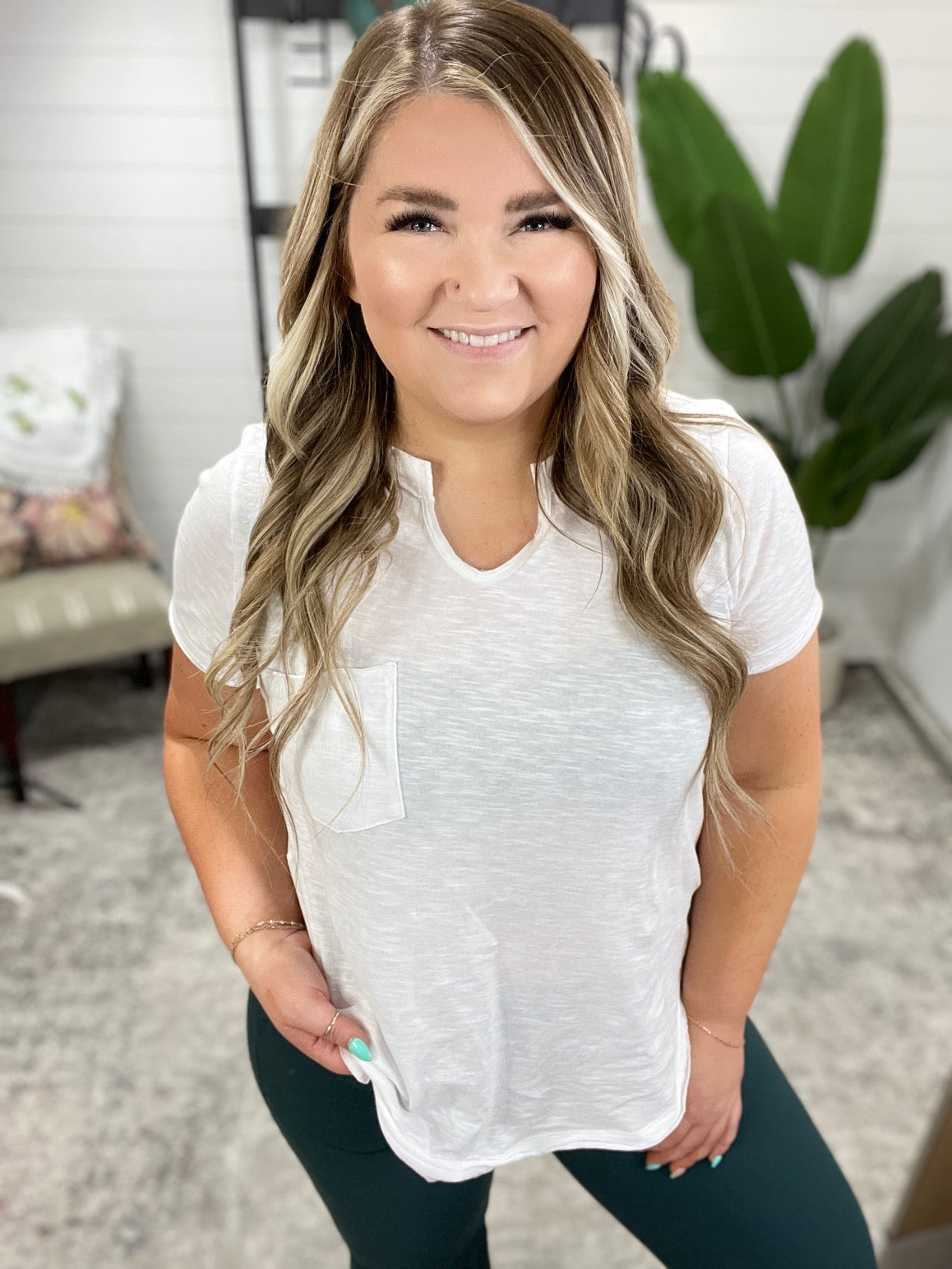 This Keep it Simple Relaxed T-Shirt is made of crinkle cotton with burnout, featuring a raw edge and keyhole neckline for a unique look. The exposed rear seam and front pocket add functionality to this stylish shirt. No stretch, but plenty of comfort!