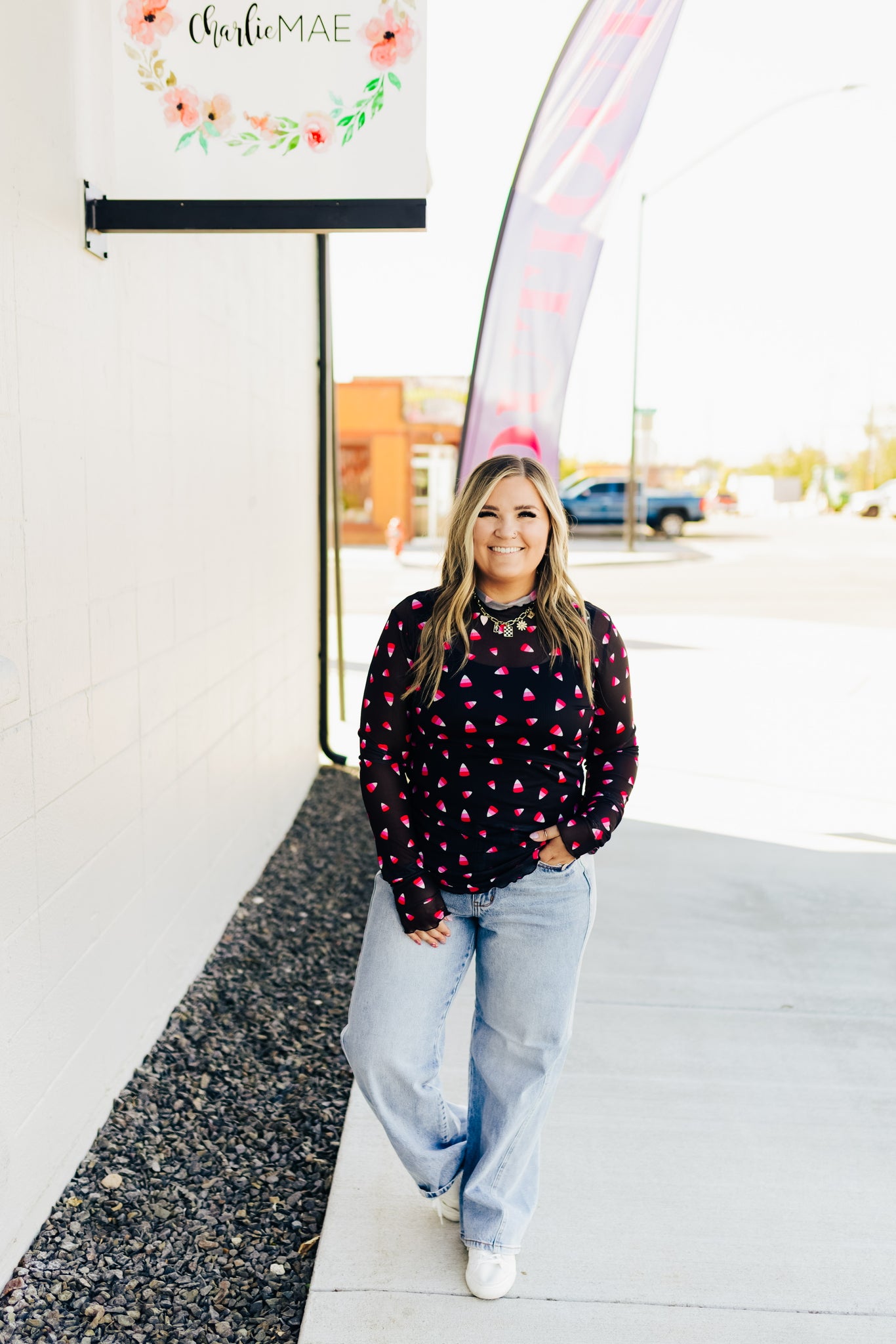 Sweeten up your spooky style with the Keigan Mesh Top in Candy Corn! This lightweight, sheer mesh long sleeve features an adorable candy corn print in the prettiest shades of pink and orange. It's stretchy, breathable, and perfect for layering under graphic tees, vests, or spooky-season cardis.
