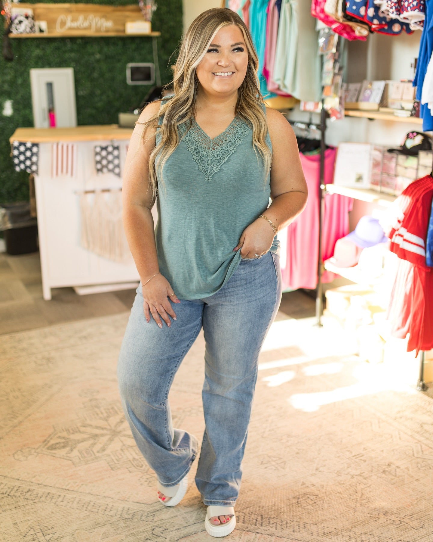 solid T/R span Slub Sleeveless Tank with Lace Neckline
