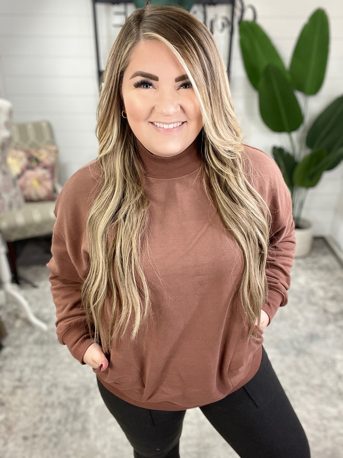 Wrap yourself in comfortable luxury with this Leena Mock Neck Pullover. Crafted from sweatshirt fleece for a soft, luxurious feel, the pullover features a ribbed mock neckline, dropped shoulder, side pockets, and relaxed fit for all-day comfort and style.
