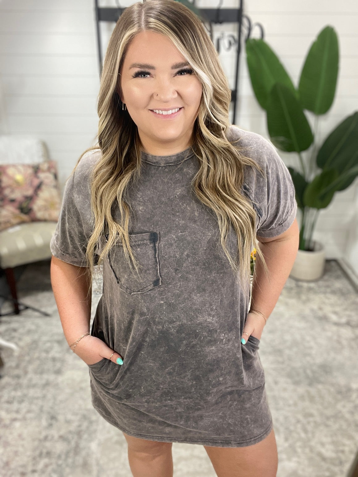 Be the ultimate style maven with our Let Me Pick Mineral Wash Dress! This lightweight jersey knit dress features a round neckline and raglan sleeves for a relaxed, yet chic look. The tacked sleeve cuff and exposed hem patch pocket add unique touches, while functional side pockets provide practicality. Perfect for any occasion, this dress is sure to be your new go-to!