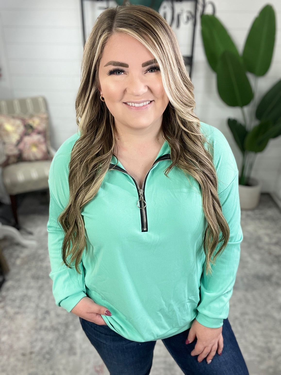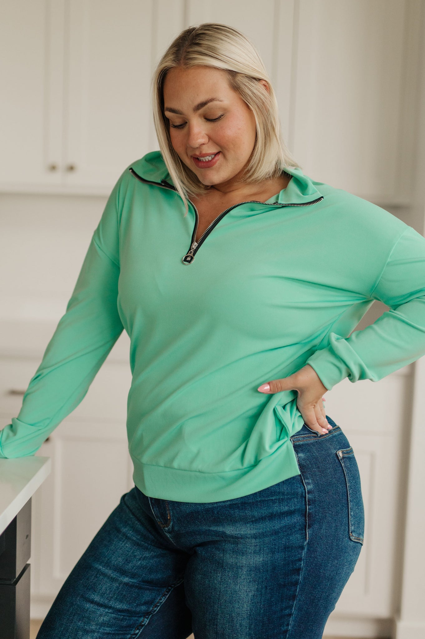 Stay cozy and comfortable with this minty-fresh Let Me Think On It Half Zip Pullover. Made with a performance knit fabric, it features a contrasting half zip and a mock neck for an extra bit of warmth. Perfect for working out or just lounging around.