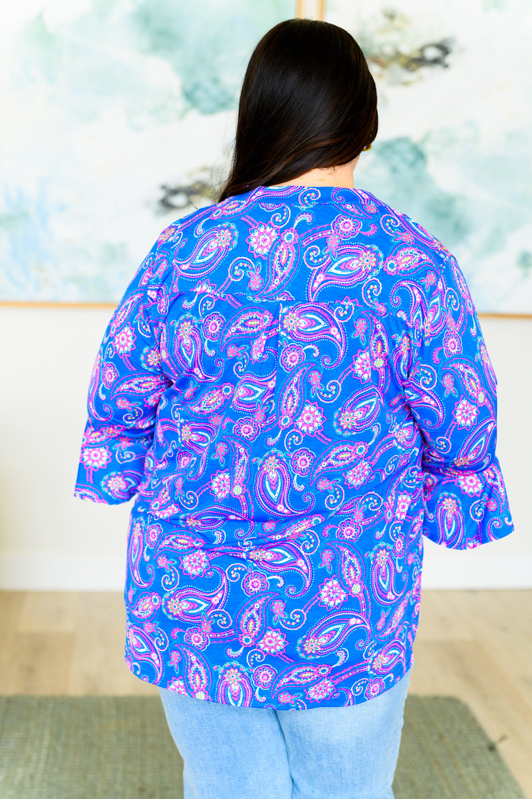 Upgrade your wardrobe with our Lizzy Bell Sleeve Top. Made with easy-to-wear bulgari fabric, the Lizzy v-neckline and 3/4 length bell sleeves provide both comfort and style. Stand out with the cutest print and make a statement wherever you go.