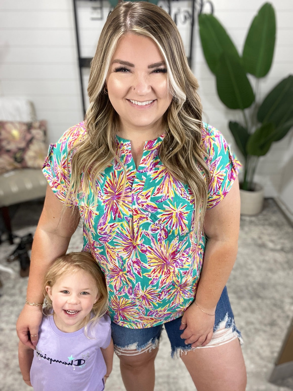 Lizzy Cap Sleeve Top in Emerald Multi Palm Trees
