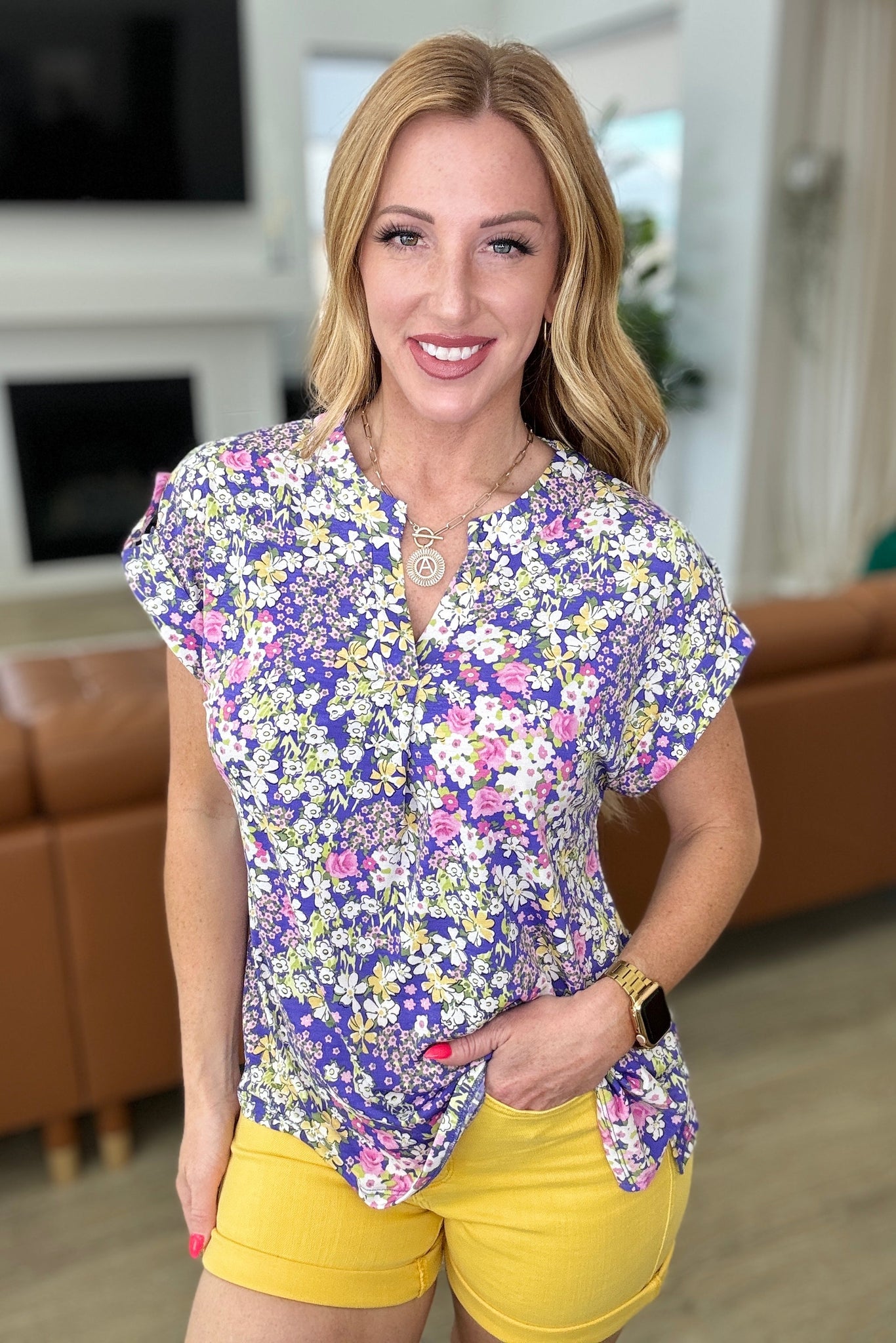 Revamp your wardrobe with the Lizzy Cap Sleeve Top in Lavender and Lime Ditsy Floral. Crafted from Bulgari fabric, this top boasts a playful Lizzy neckline and rolled sleeves with button tabs for a unique touch. The cap short sleeve and scoop hem bring a hint of flow to this trendy piece. Enjoy both comfort and style with the Lizzy Top.