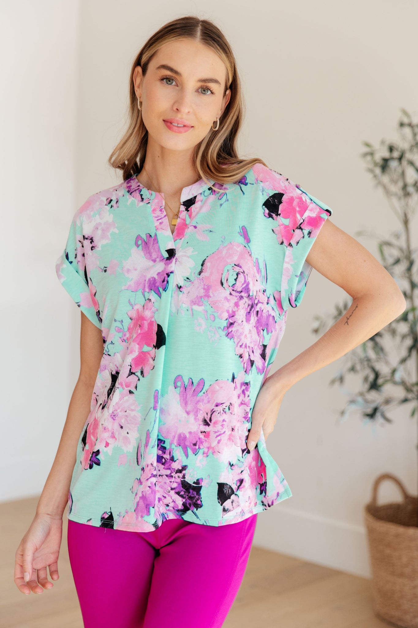 Revamp your wardrobe with the Lizzy Cap Sleeve Top in Lavender and Sky Floral. Crafted from Bulgari fabric, this top boasts a playful Lizzy neckline and button rolled sleeve tabs for a unique touch. The cap short sleeve and scoop hem bring a hint of flow to this trendy piece. Enjoy both comfort and style with the Lizzy Top.
