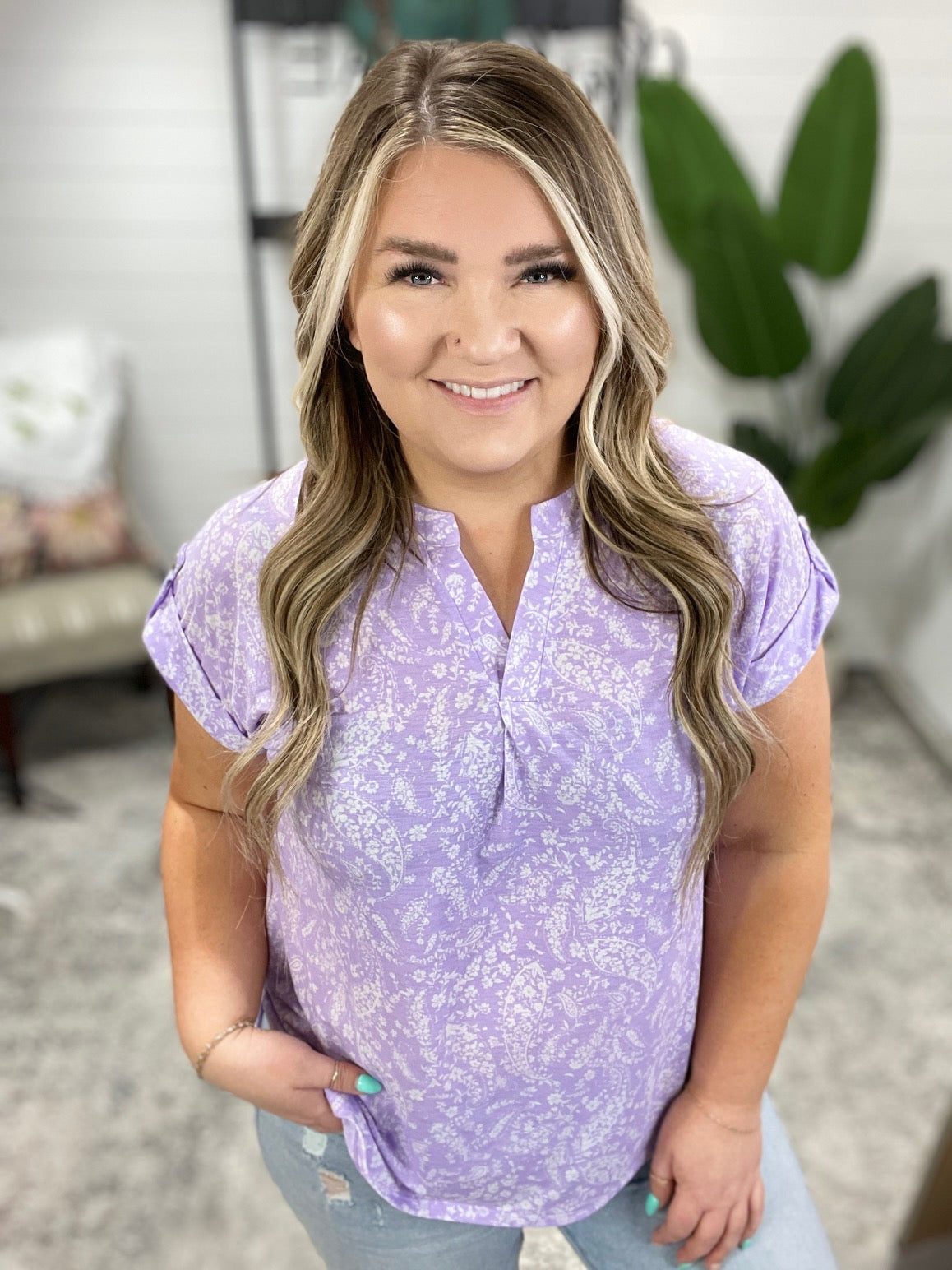 Revamp your wardrobe with the Lizzy Cap Sleeve Top in Lavender and White Floral. Crafted from Bulgari fabric, this top boasts a playful Lizzy neckline and rolled sleeves with button tabs for a unique touch. The cap short sleeve and scoop hem bring a hint of flow to this trendy piece. Enjoy both comfort and style with the Lizzy Top.