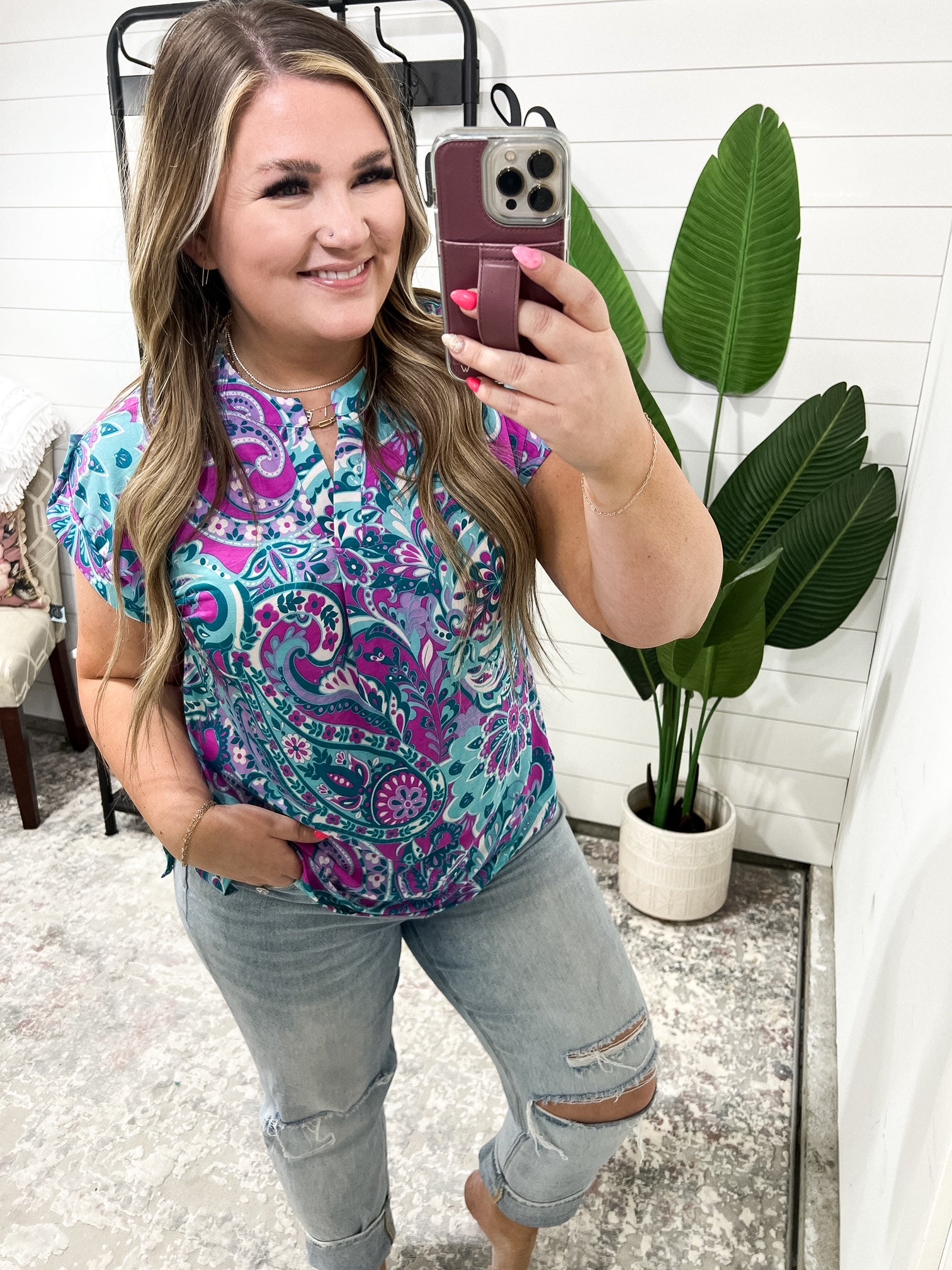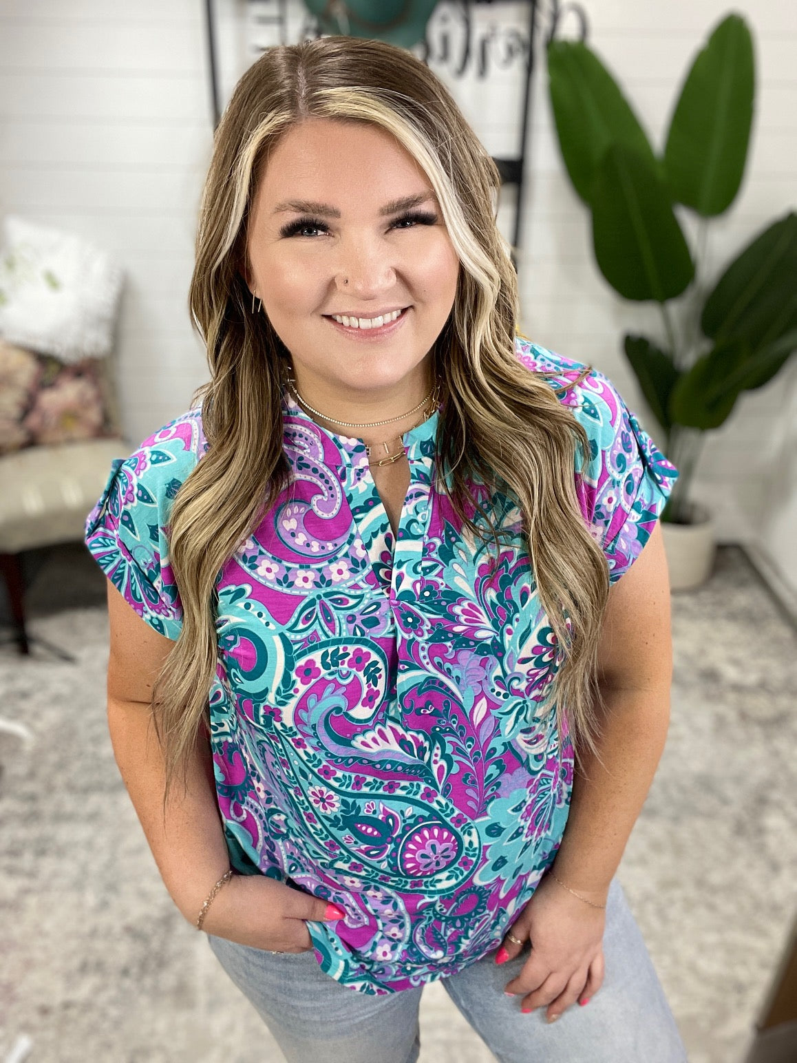 Revamp your wardrobe with the Lizzy Cap Sleeve Top in Magenta and Teal Paisley. Crafted from Bulgari fabric, this top boasts a playful Lizzy neckline and button rolled sleeve tabs for a unique touch. The cap short sleeve and scoop hem bring a hint of flow to this trendy piece. Enjoy both comfort and style with the Lizzy Top.