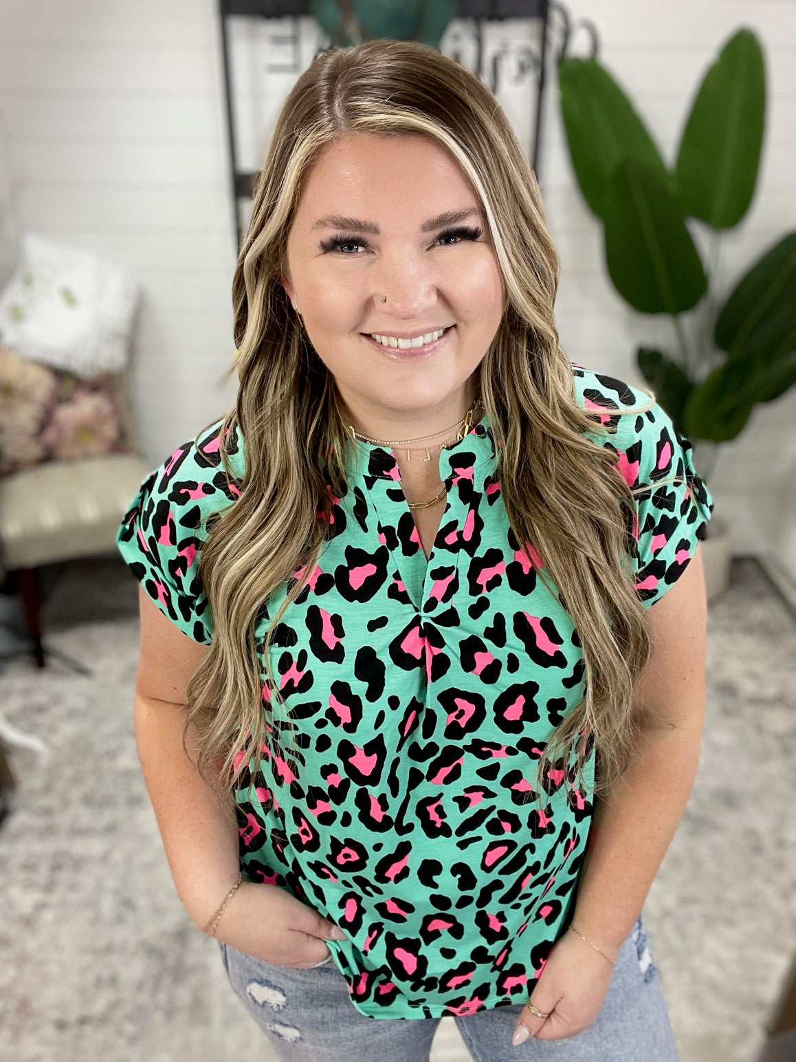 Transform your closet with the Lizzy Top in Mint and Pink Leopard. Made from Bulgari, this top features a gabby neckline and button rolled sleeve tabs for a comfortable, yet eye-turning piece. The 3/4 sleeve and scoop hem add flow to the already stylish piece. Experience comfort and style in one with the Lizzy Top.