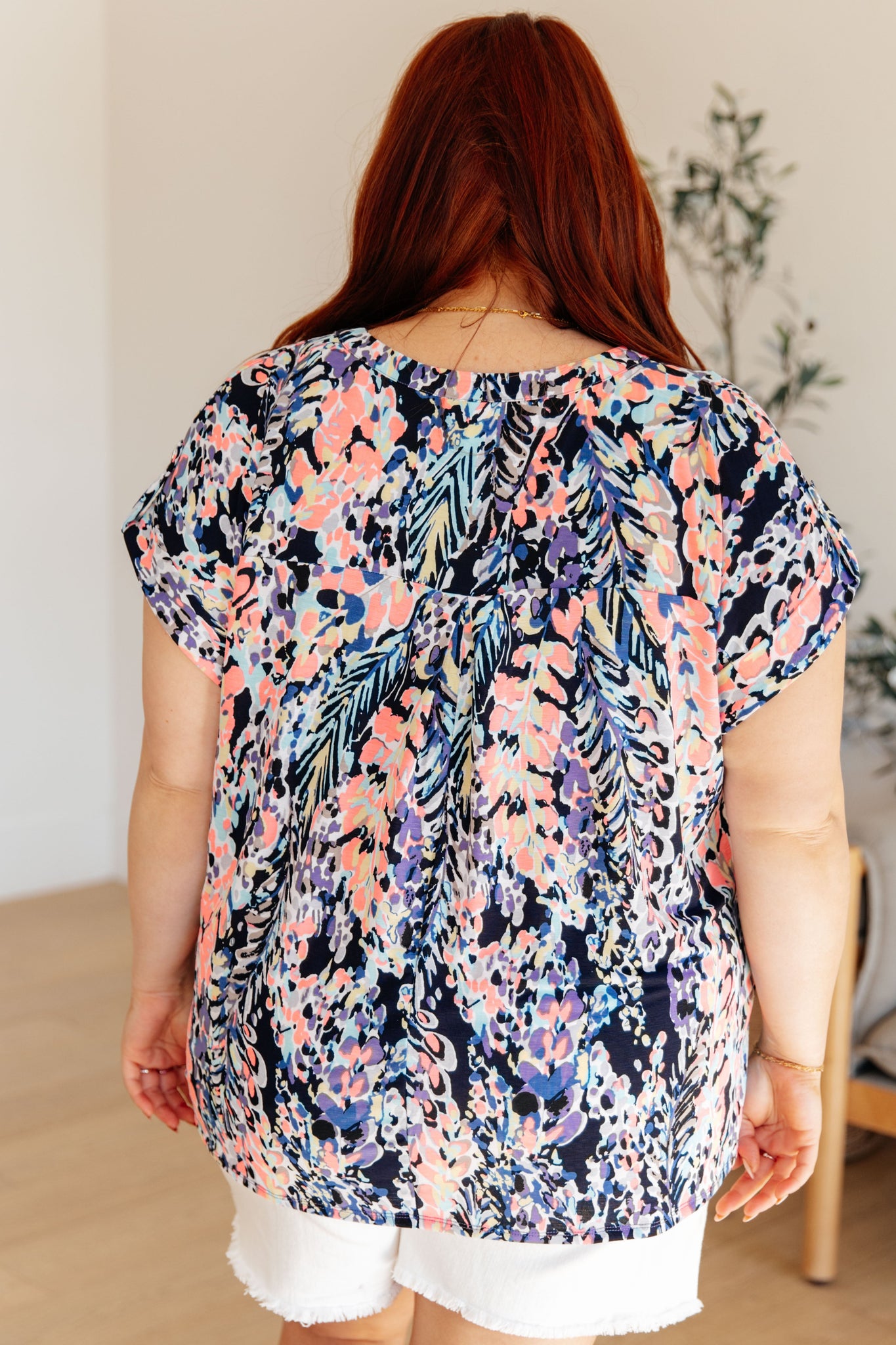 Revamp your wardrobe with the Lizzy Cap Sleeve Top in Navy Abstract Floral. Crafted from Bulgari fabric, this top boasts a playful Lizzy neckline and button rolled sleeve tabs for a unique touch. The cap short sleeve and scoop hem bring a hint of flow to this trendy piece. Enjoy both comfort and style with the Lizzy Top.