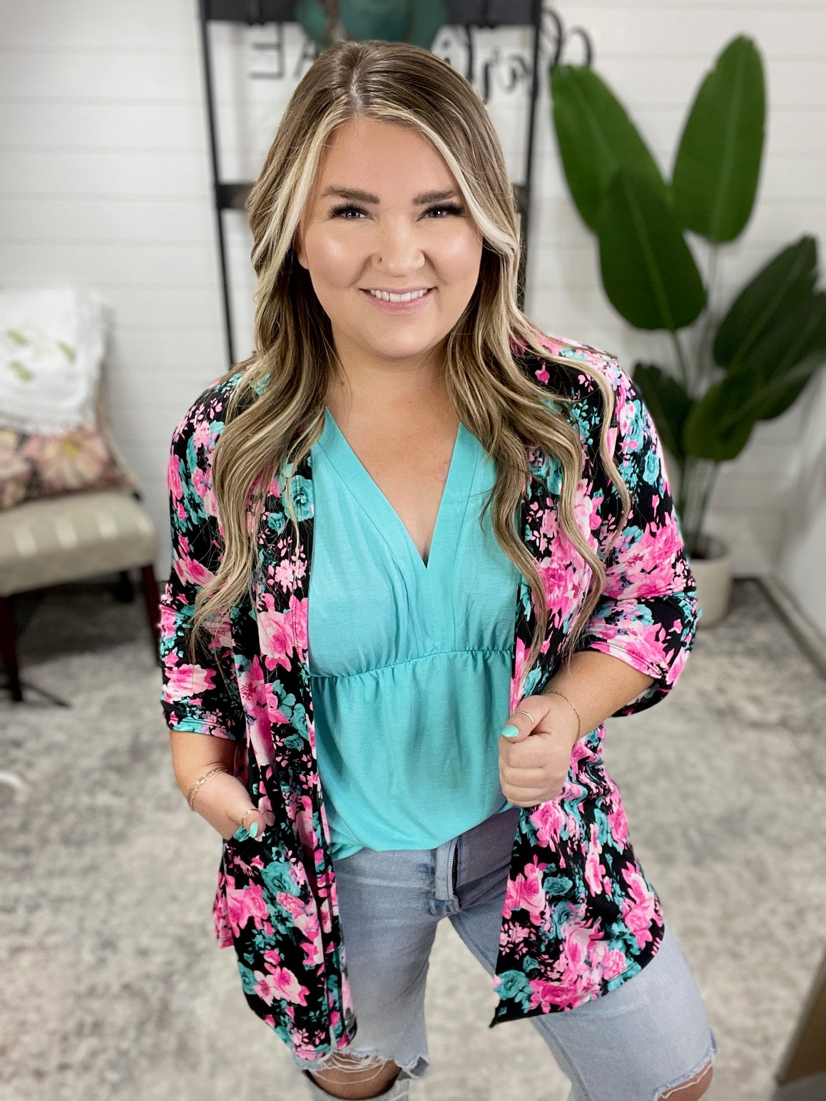 Introducing the Lizzy Cardigan in Black and Pink Floral, the perfect blend of style and comfort. Stay cool with the Bulagri fabric and enjoy the wrinkle-resistant and lightweight properties. Featuring faux button tabs on 3/4 sleeves, an open front, and a pleated back for a unique look. With functional pockets and a comfortable fit, this cardigan is a must-have. Order now for a fresh and playful look (and cozy comfort)!