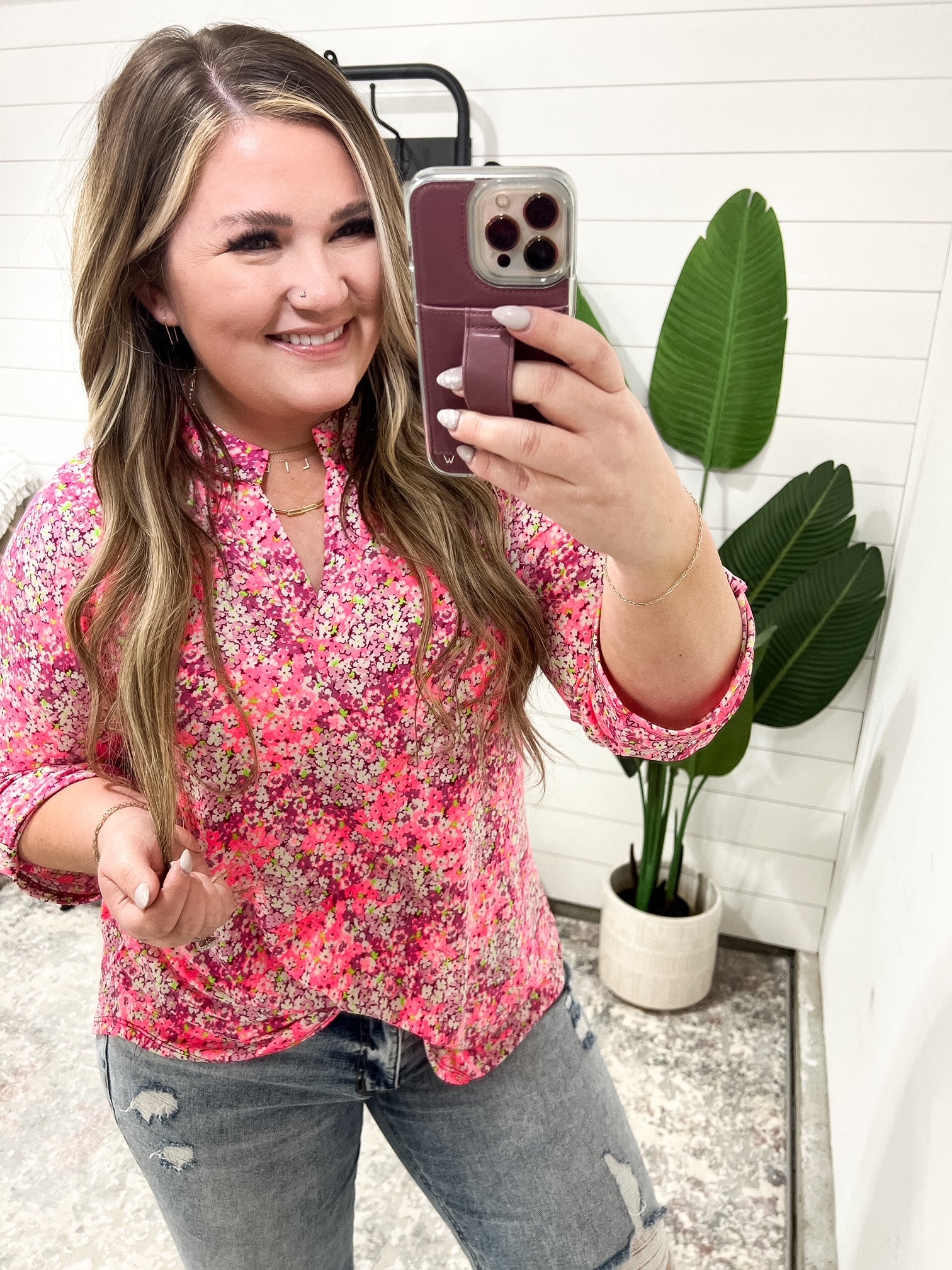 Transform your closet with the Lizzy Top in Ditsy Floral Magenta. Made from Bulgari, this top features a gabby neckline and button rolled sleeve tabs for a comfortable, yet eye-turning piece. The 3/4 sleeve and scoop hem add flow to the already stylish piece. Experience comfort and style in one with the Lizzy Top.