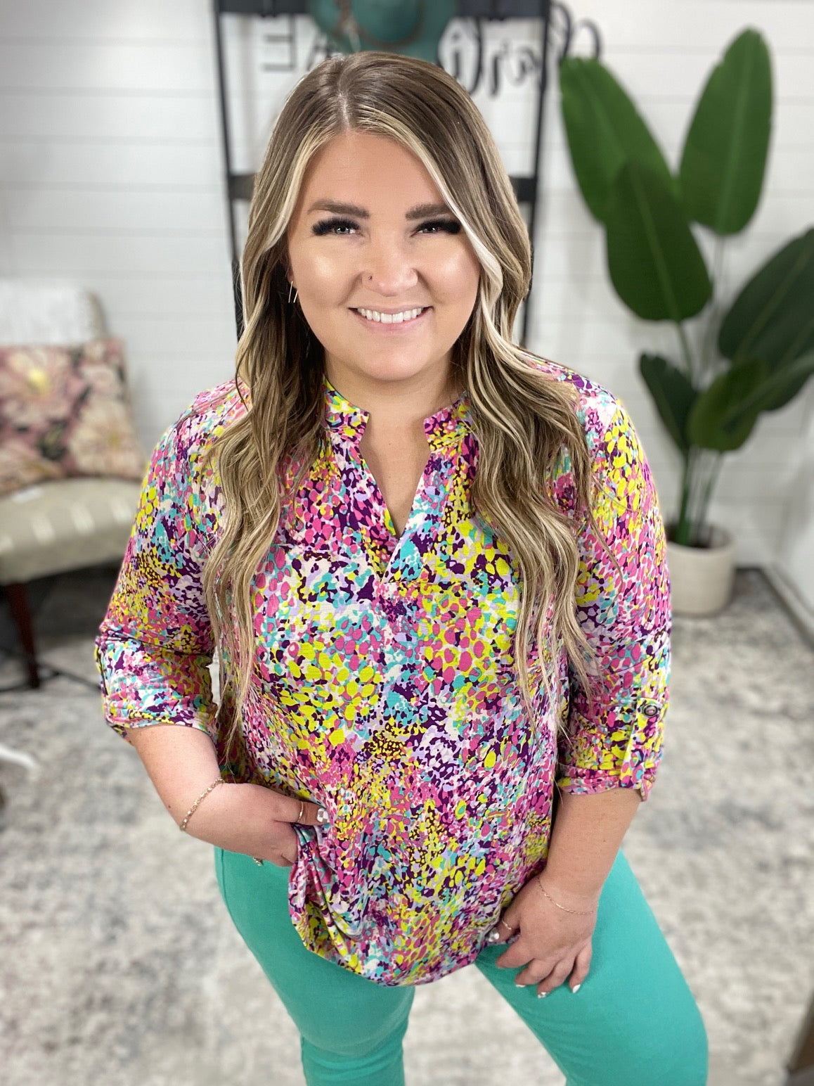 Transform your closet with the Lizzy Top. Made from Bulgari fabric, this top features a gabby neckline and rolled sleeves with button tabs for a comfortable, yet eye catching piece. The 3/4 sleeve and scoop hem add flow to the already stylish piece. Experience comfort and style in one with the Lizzy Top.