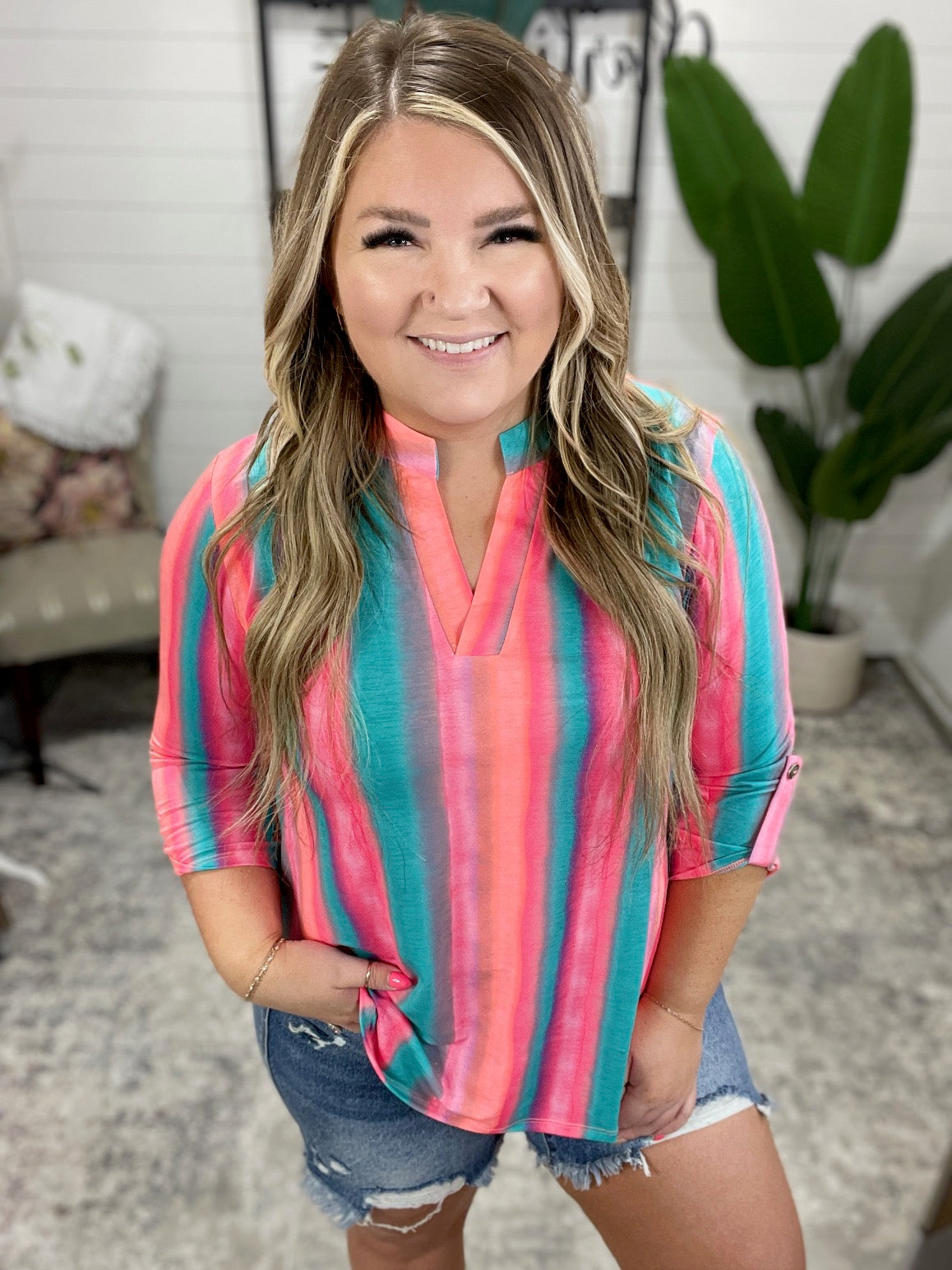 Transform your closet with the Lizzy Top in Ombre Mint Stripe. Made from Bulgari, this top features a gabby neckline and button rolled sleeve tabs for a comfortable, yet eye-turning piece. The 3/4 sleeve and scoop hem add flow to the already stylish piece. Experience comfort and style in one with the Lizzy Top.