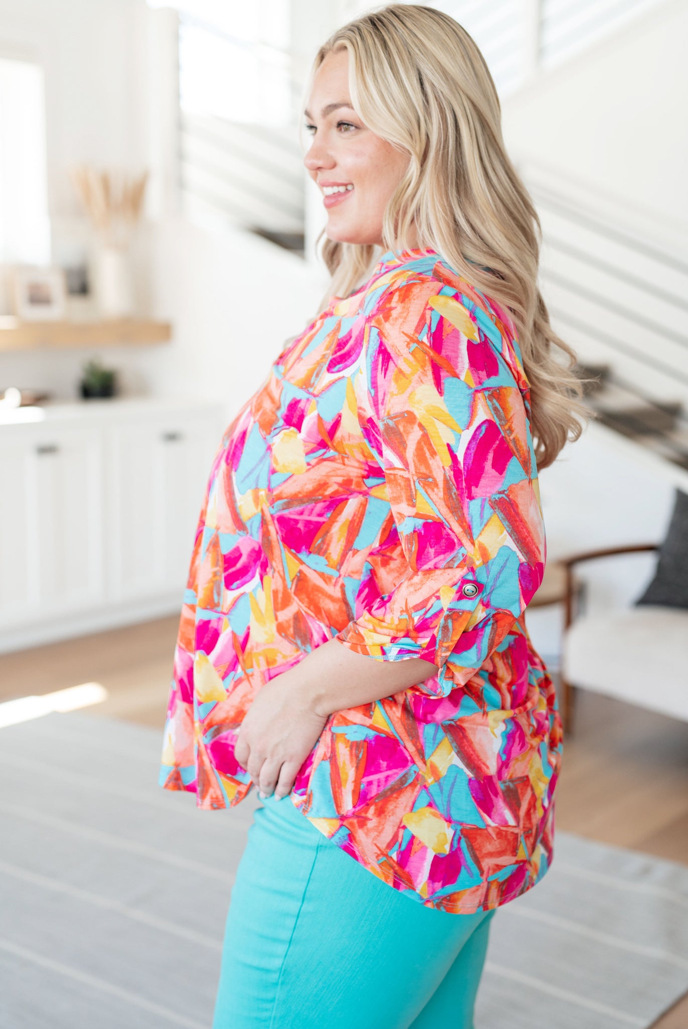 Transform your closet with the Lizzy Top. Made from Bulgari fabric, this top features a gabby neckline and rolled sleeves with button tabs for a comfortable, yet eye catching piece. The 3/4 sleeve and scoop hem add flow to the already stylish piece. Experience comfort and style in one with the Lizzy Top.