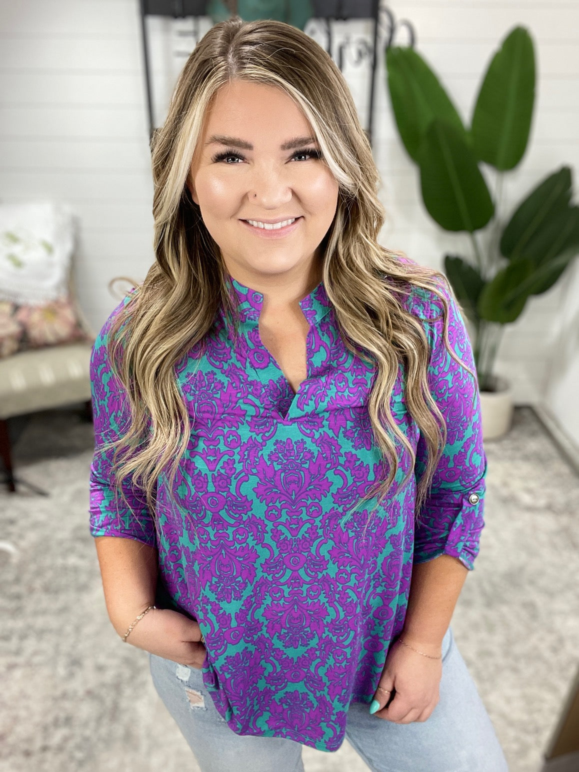 Transform your closet with the Lizzy Top in Teal and Magenta Damask. Made from Bulgari, this top features a gabby neckline and button rolled sleeve tabs for a comfortable, yet eye-turning piece. The 3/4 sleeve and scoop hem add flow to the already stylish piece. Experience comfort and style in one with the Lizzy Top.