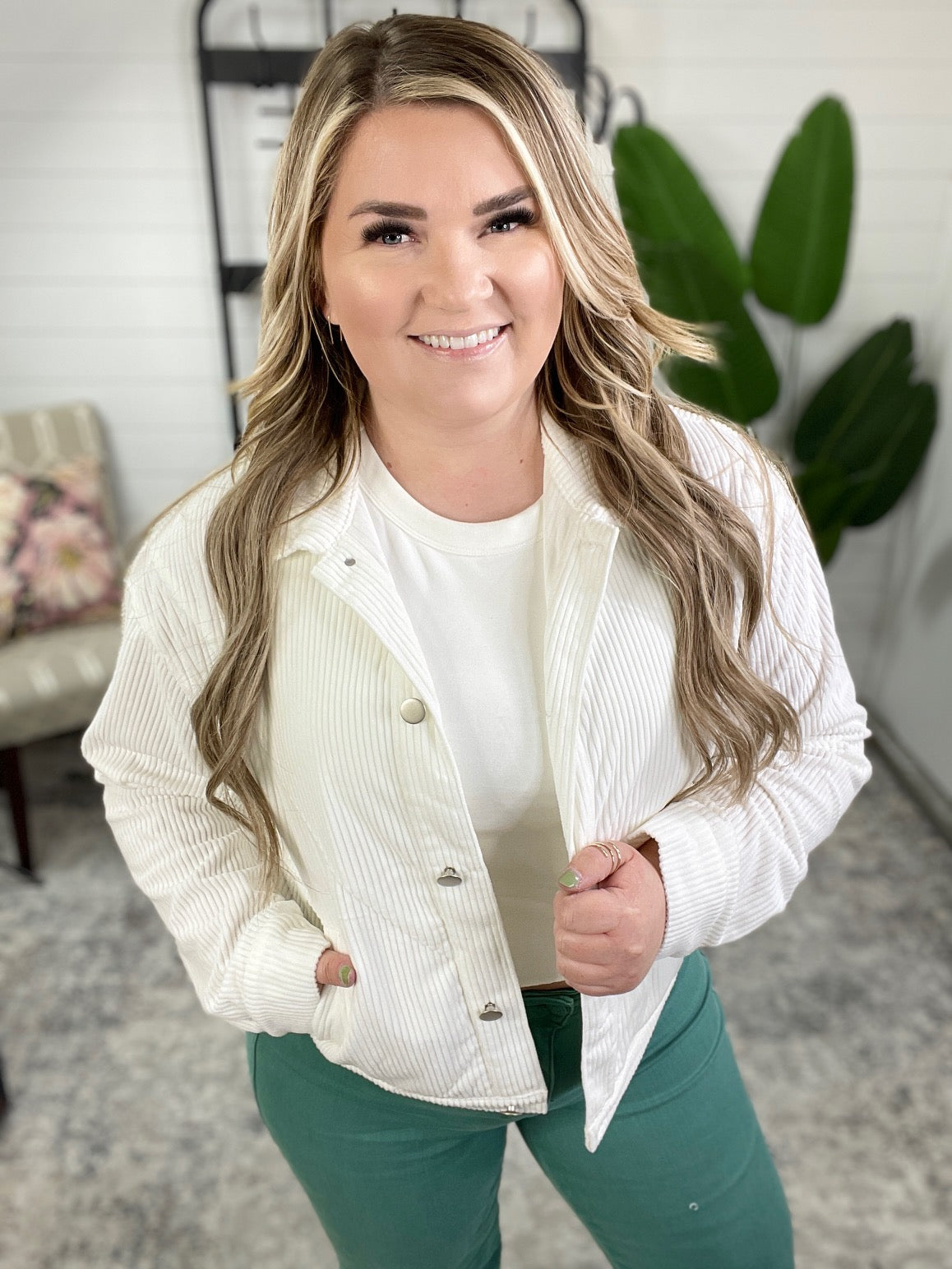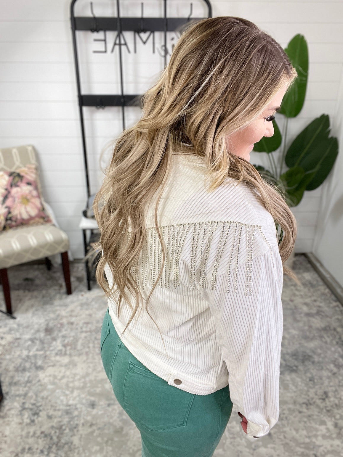 Experience glamour and grace with the Loretta Rhinestone Fringe Jacket. Made with luxuriously-soft corduroy, this show-stopping piece dazzles with its intricate rhinestone fringe details. With a flattering button closure, front pockets, and collar detail, this one-of-a-kind creation is sure to be a hit. You’re gonna look like a million bucks!