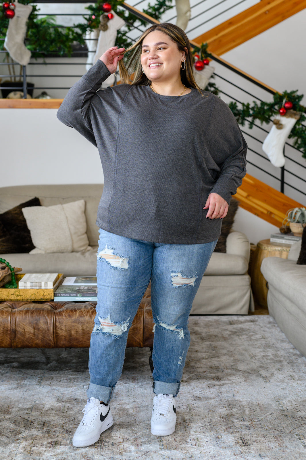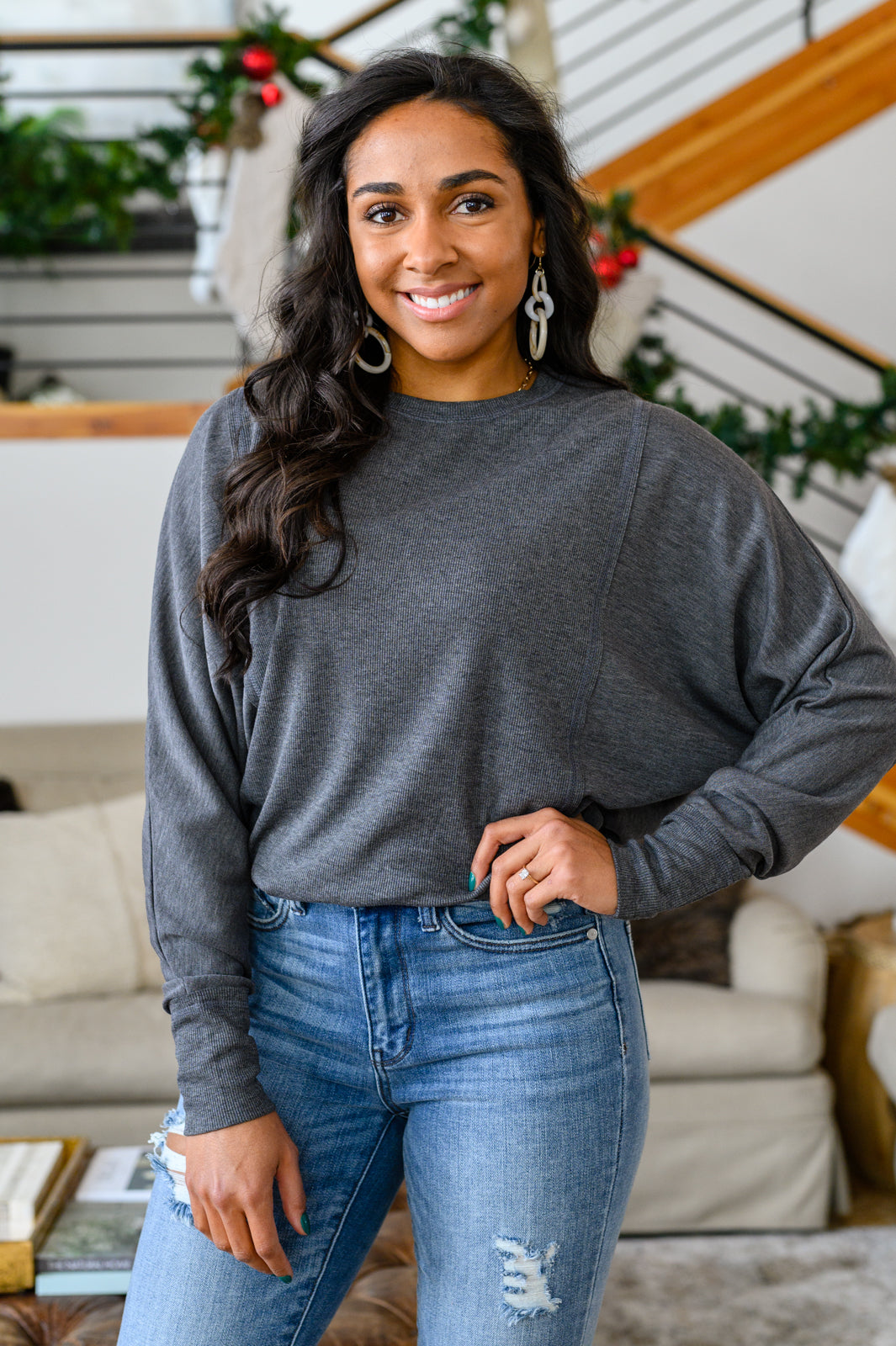 If you're going to throw on a lazy, cute fit it should include the Lounge Around Long Sleeve Paneled Pullover! This comfy long sleeve features a ribbed fabric that shapes the body along with elongated sleeve cuffs. A contrasting fabric makes up the side panels and sleeves including a round neckline, dolman style sleeves and a slightly rounded hem finish to this perfect toss-on top!