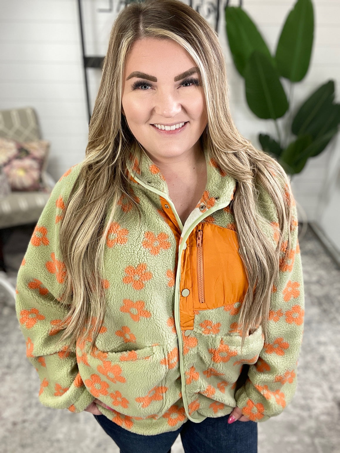 Cozy up in style with our Love It Don't Leave It Floral Fleece Jacket! Made with sherpa fleece for ultimate softness, this jacket features a playful floral print and convenient snap and zip pockets. Perfect for those chilly days when you want to stay cozy and cute.