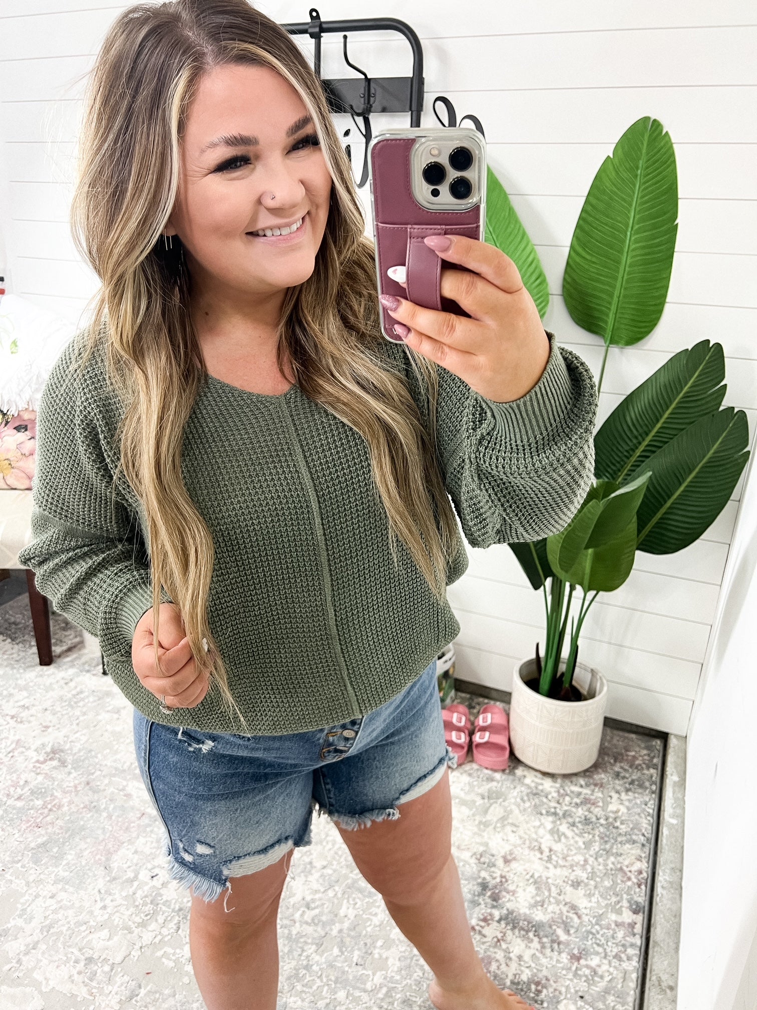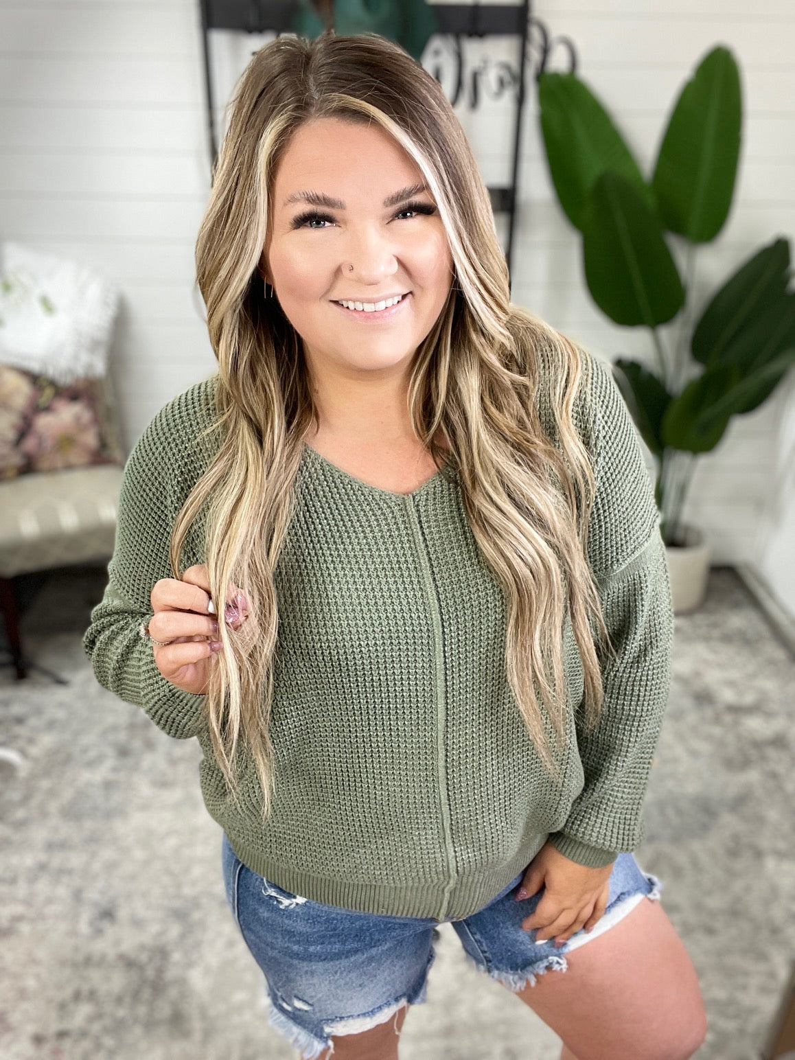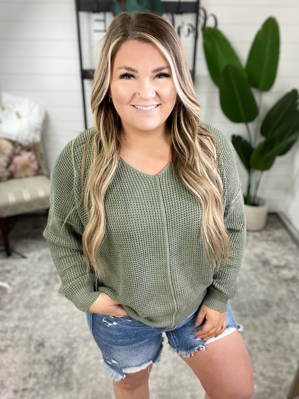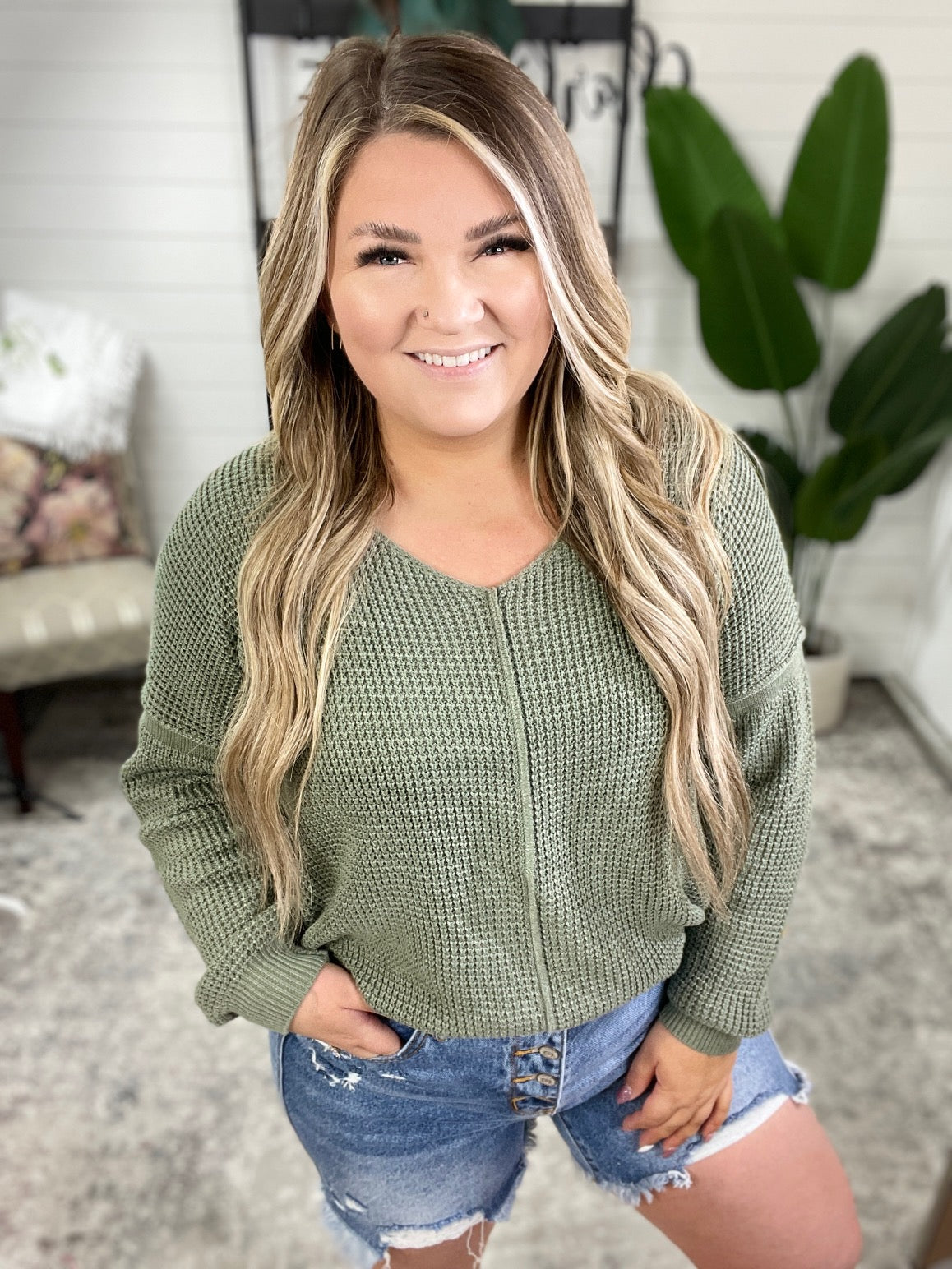 If you like staying cozy while also looking cute, the Magi Lune V-Neck Sweater is the perfect sweater for you. With its medium weight sweater knit, this sweater is perfect for cool evenings. The v-neckline and exposed seams add a touch of edge, while the drop shoulder, ribbed sleeve cuff, and ribbed hemline provide a comfortable fit.