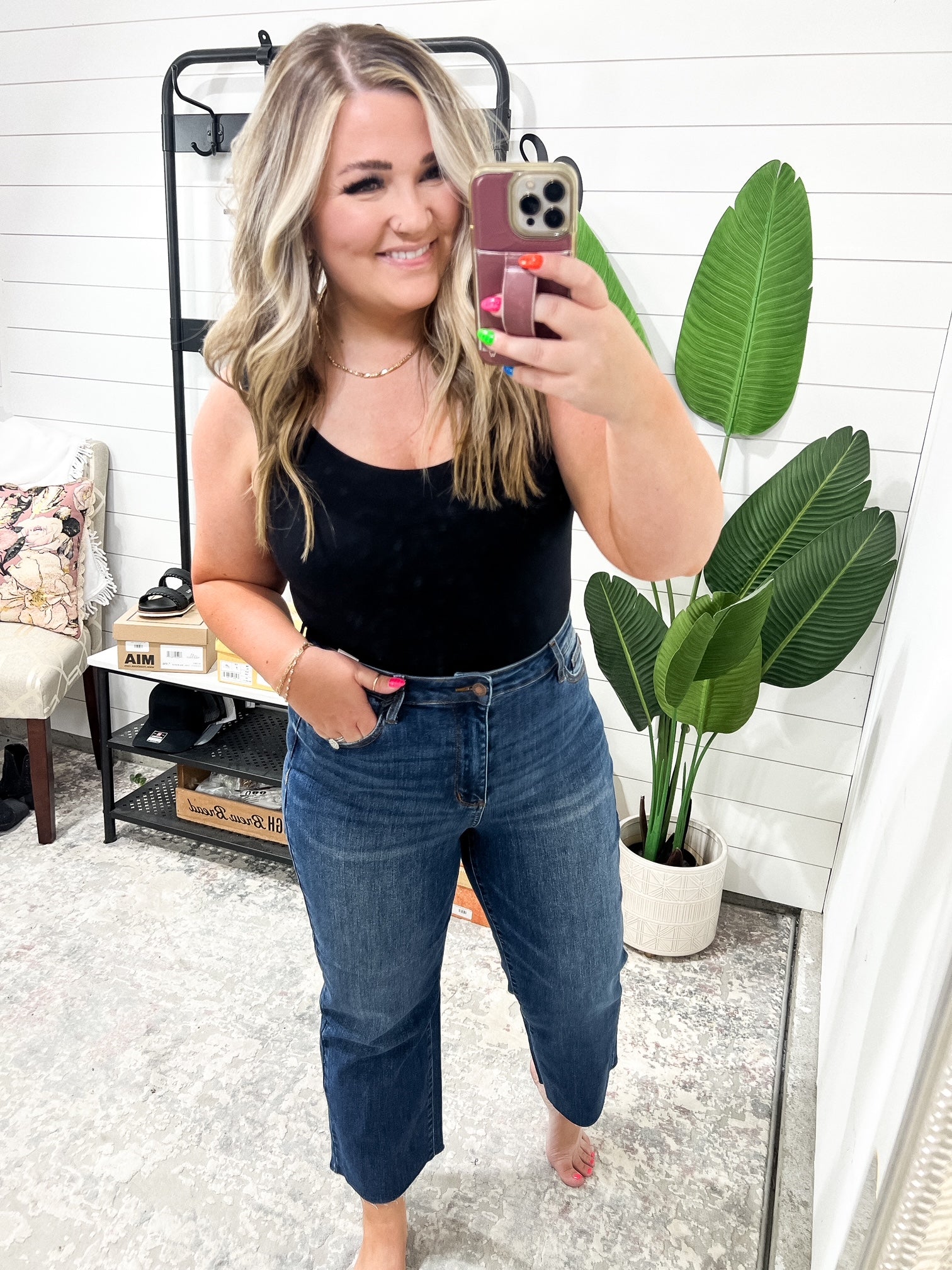 Elevate your style with the Maisie High Waist Crop Wide jeans. Featuring a flattering high-rise fit and a trendy zip fly, these dark wash jeans showcase a raw hem and wide leg silhouette for a modern, effortless look. The back pocket embroidery adds a unique touch, making them perfect for standing out while staying comfortable all day. Ideal for pairing with your favorite tops, these jeans combine fashion and function seamlessly.