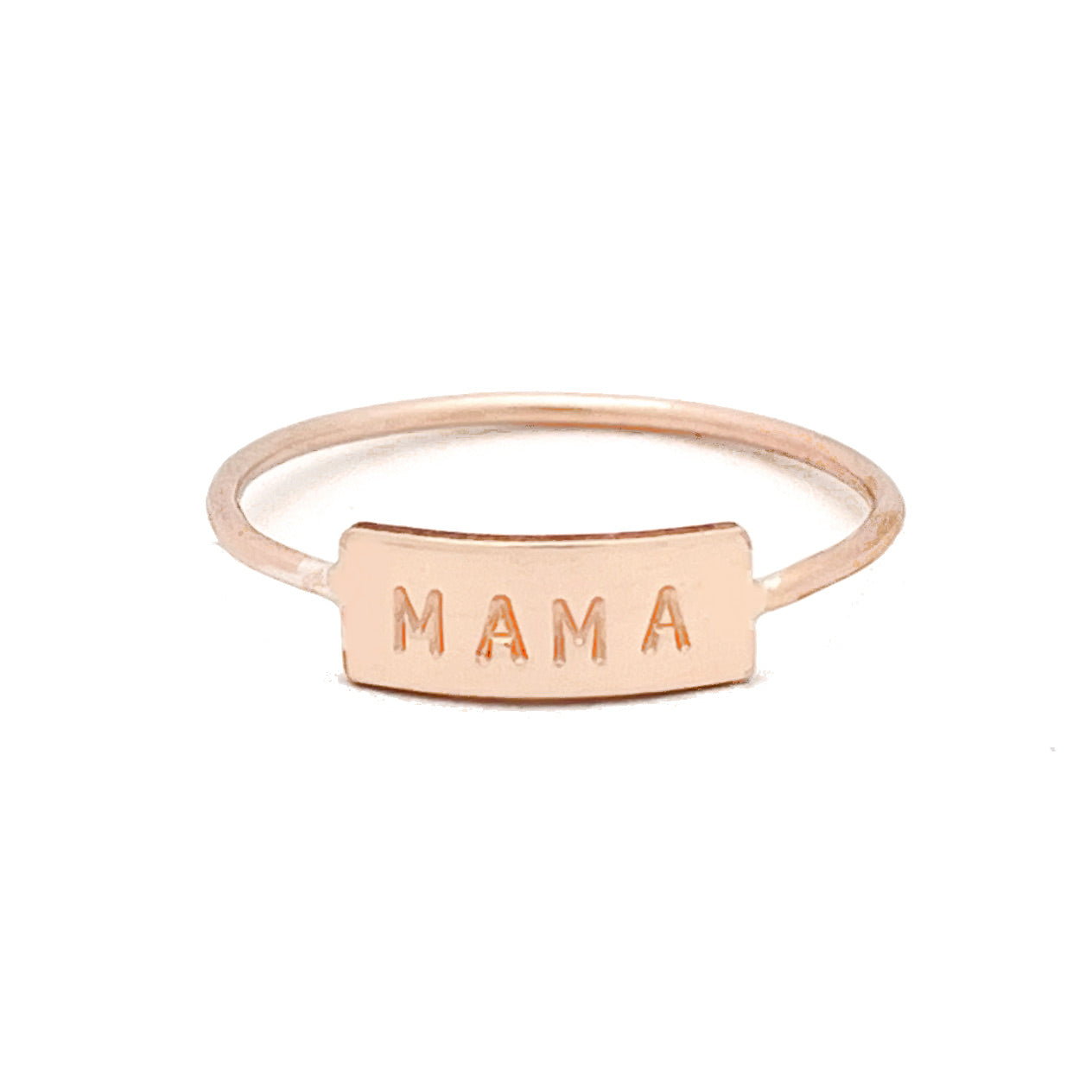 Our dainty bar ring hand stamped with the word "MAMA", available in your choice of Sterling Silver, 14k Gold Fill, or 14k Rose Gold Fill. The perfect gift for any mama.