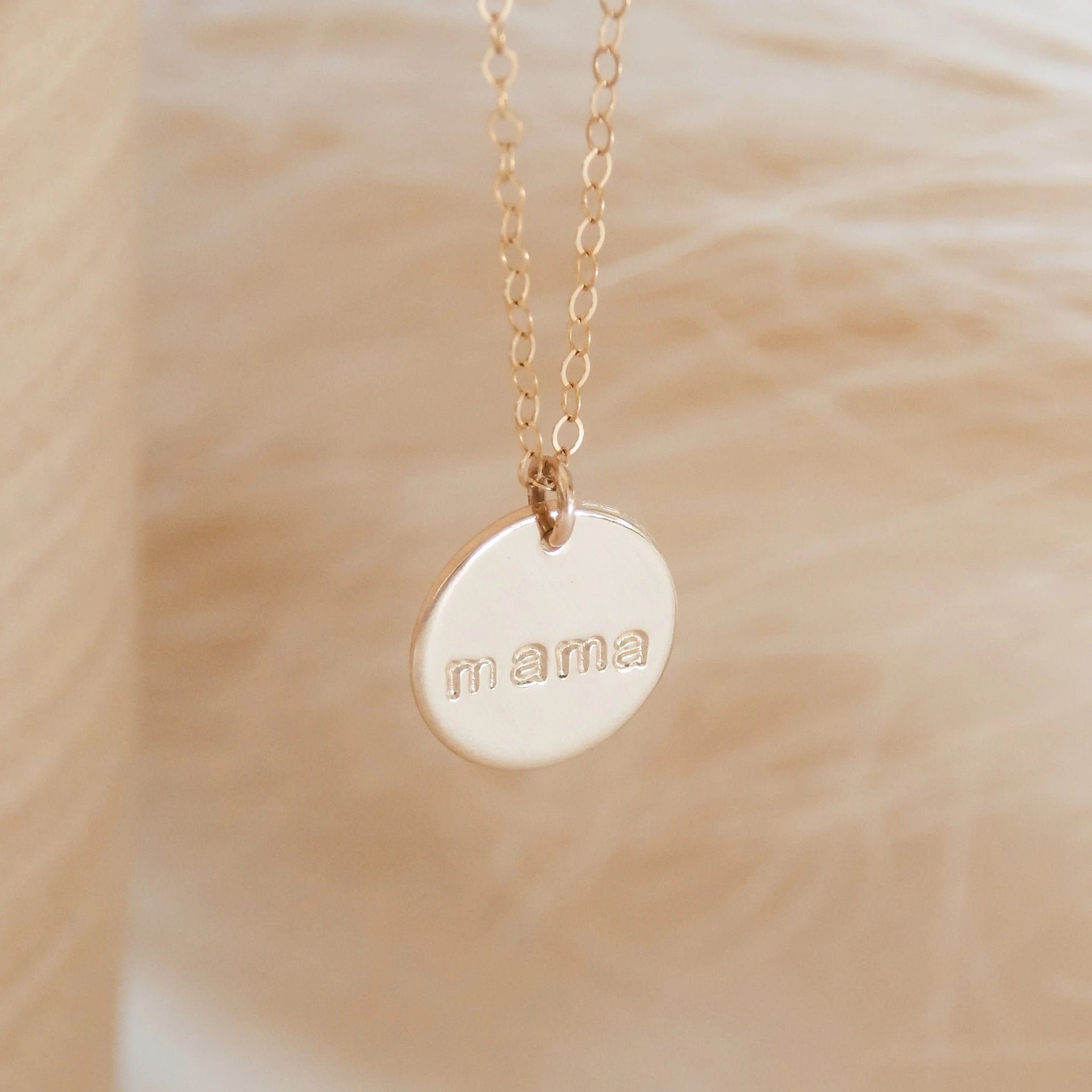 Our medium sized, 1/2" disc necklace hand stamped with the word "mama" in your choice of Sterling Silver, 14k Gold Fill, or 14k Rose Gold Fill on a matching 18" chain.