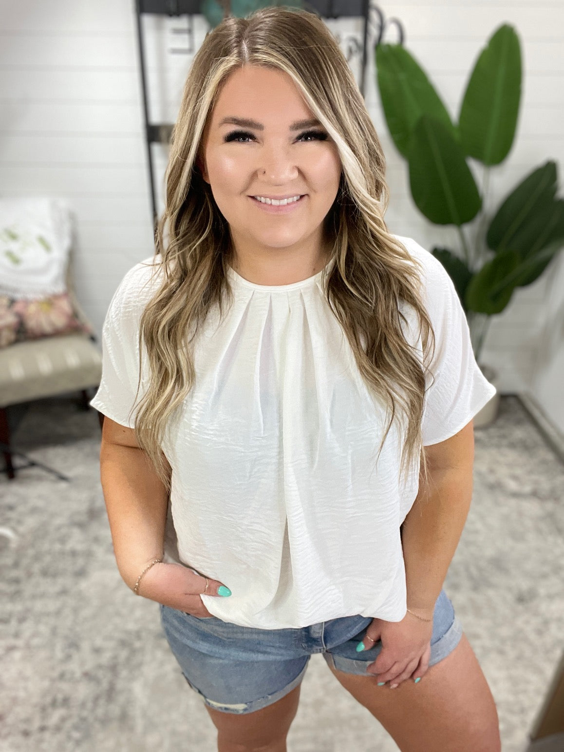 Let your style blossom with the Mild Moments Pleat Detail Top. Crafted with lightweight crinkled fabric and a pleated neckline, this easy fit blouse offers a structured yet comfortable fit. Plus, the dolman sleeve design creates a unique silhouette that won't go unnoticed.