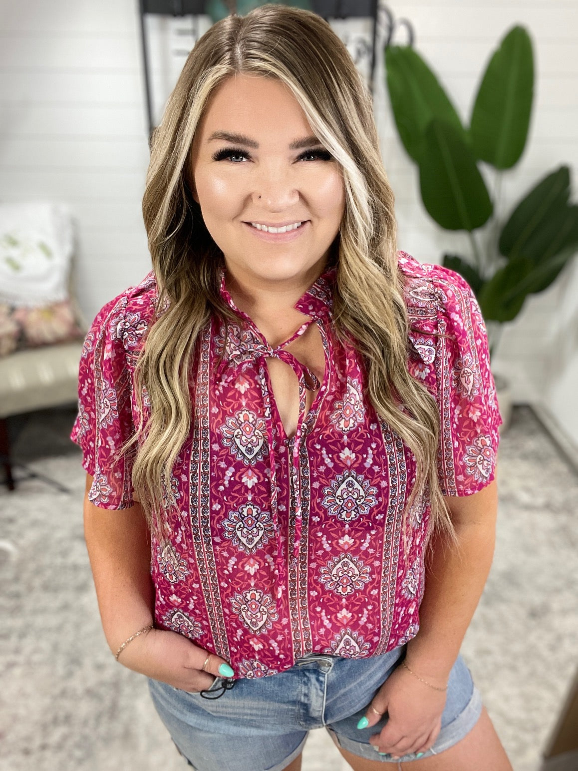 Add a touch of whimsy to your wardrobe with our Moments Like This V-Neck Bell Sleeve Blouse. The bell sleeves with ruffle accents add a playful flair, while the functional front tie adds both style and practicality. Perfect for creating memorable moments on any occasion!