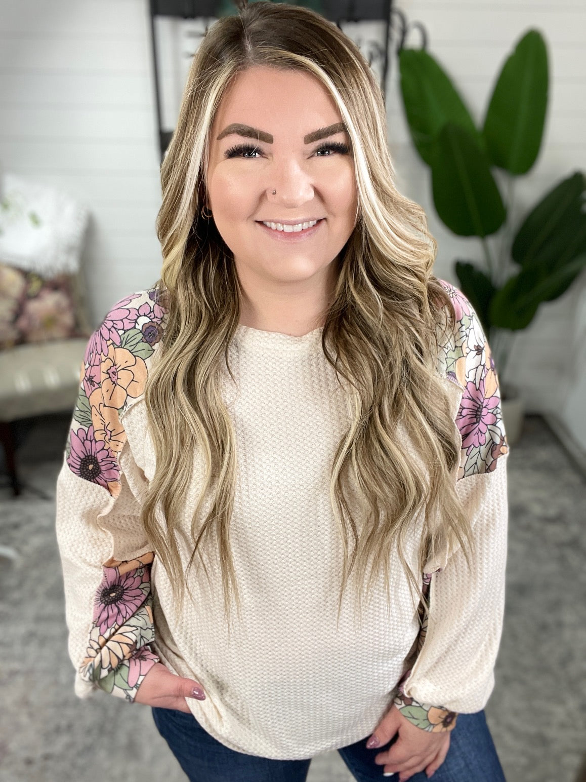 The Mountain Side Waffle Knit Long Sleeve Top effortlessly combines comfort and style. Featuring a cozy waffle knit with charming floral French Terri accents, a boat neckline and drop shoulder for a chic, relaxed look. The balloon sleeves and exposed seams add a touch of unique detail. Soft, comfortable, and breathable, this top is a must-have for your wardrobe.