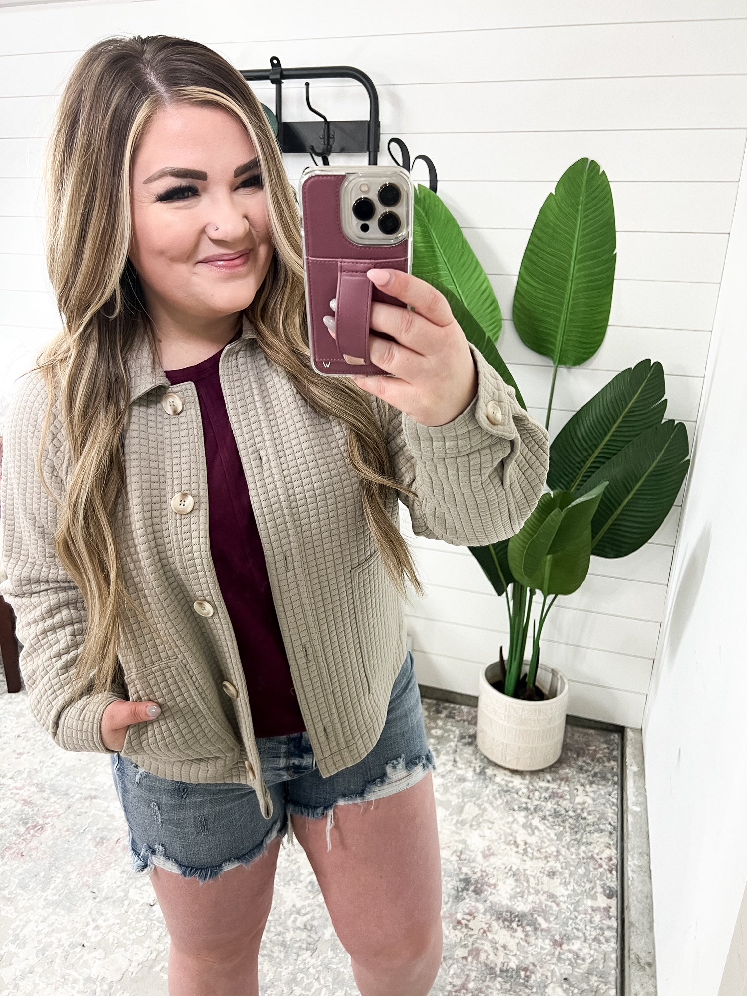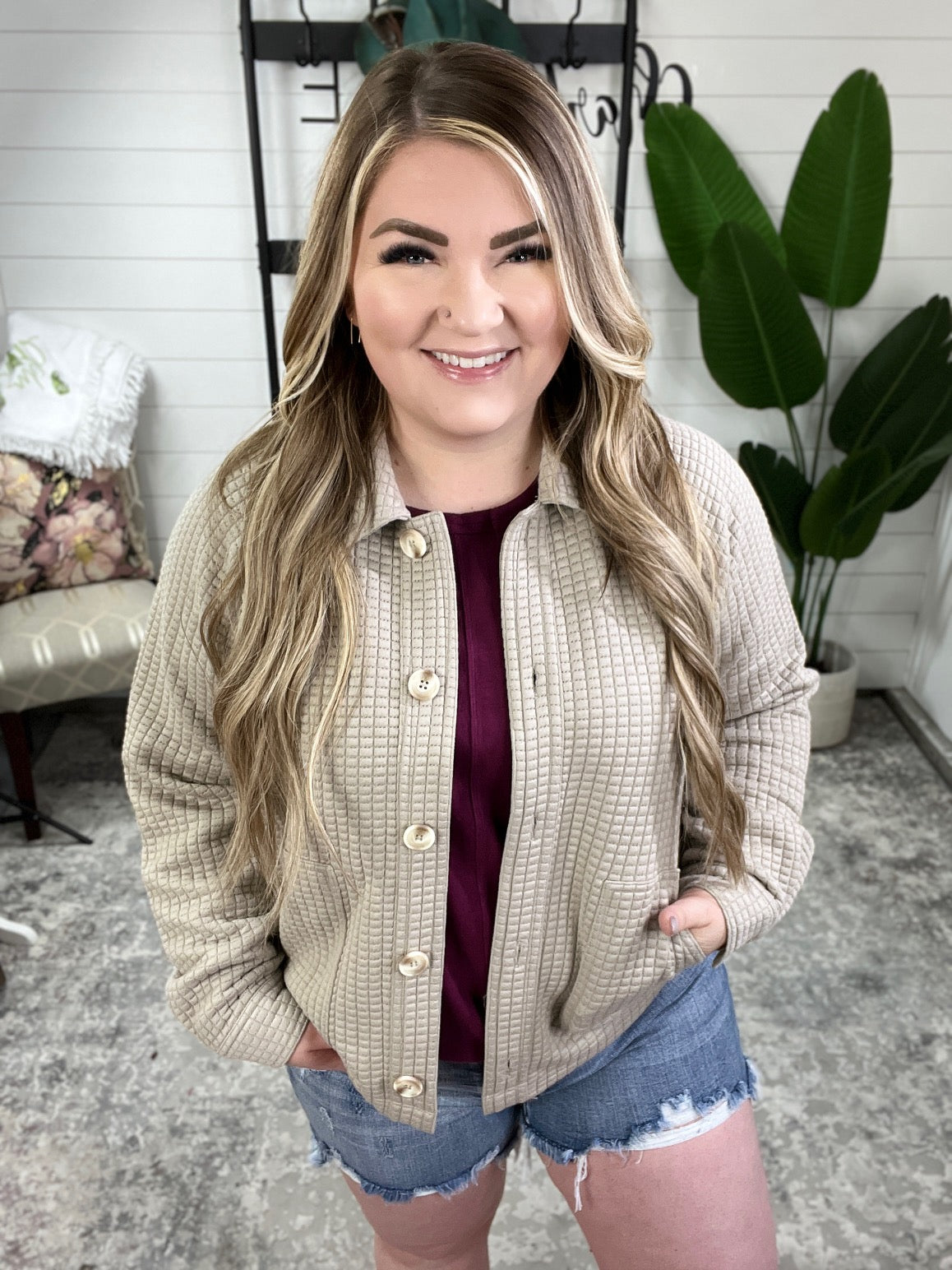 Elevate your wardrobe with our My Best Offer Quilted Texture Shacket! Made from quilted textured scuba knit, this shacket combines the comfort of a sweater with the structure of a jacket. The collared neckline, button closure, button sleeve cuff, and patch pockets add stylish details to this versatile piece.