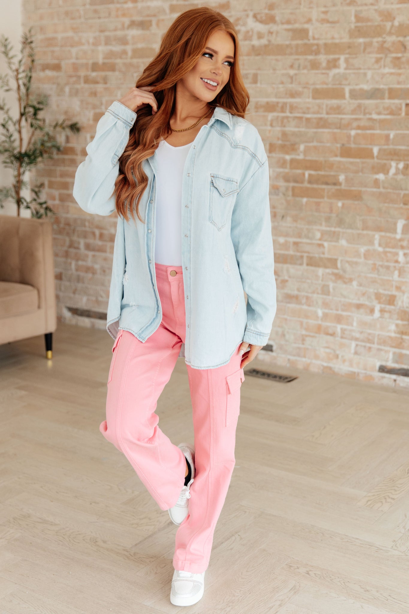 You hear that? That's the "oohs" and "ahhs" from My Walkman Denim Shacket. Crafted with lightweight denim and featuring a collared neckline, this shacket adds a touch of edge to any outfit. The faux pearl snap closures, front patch pockets, and distressed detailing add unique touches, while the banded sleeve cuffs and scooped hem provide a comfortable and flattering fit. Upgrade your wardrobe with this versatile and stylish piece.