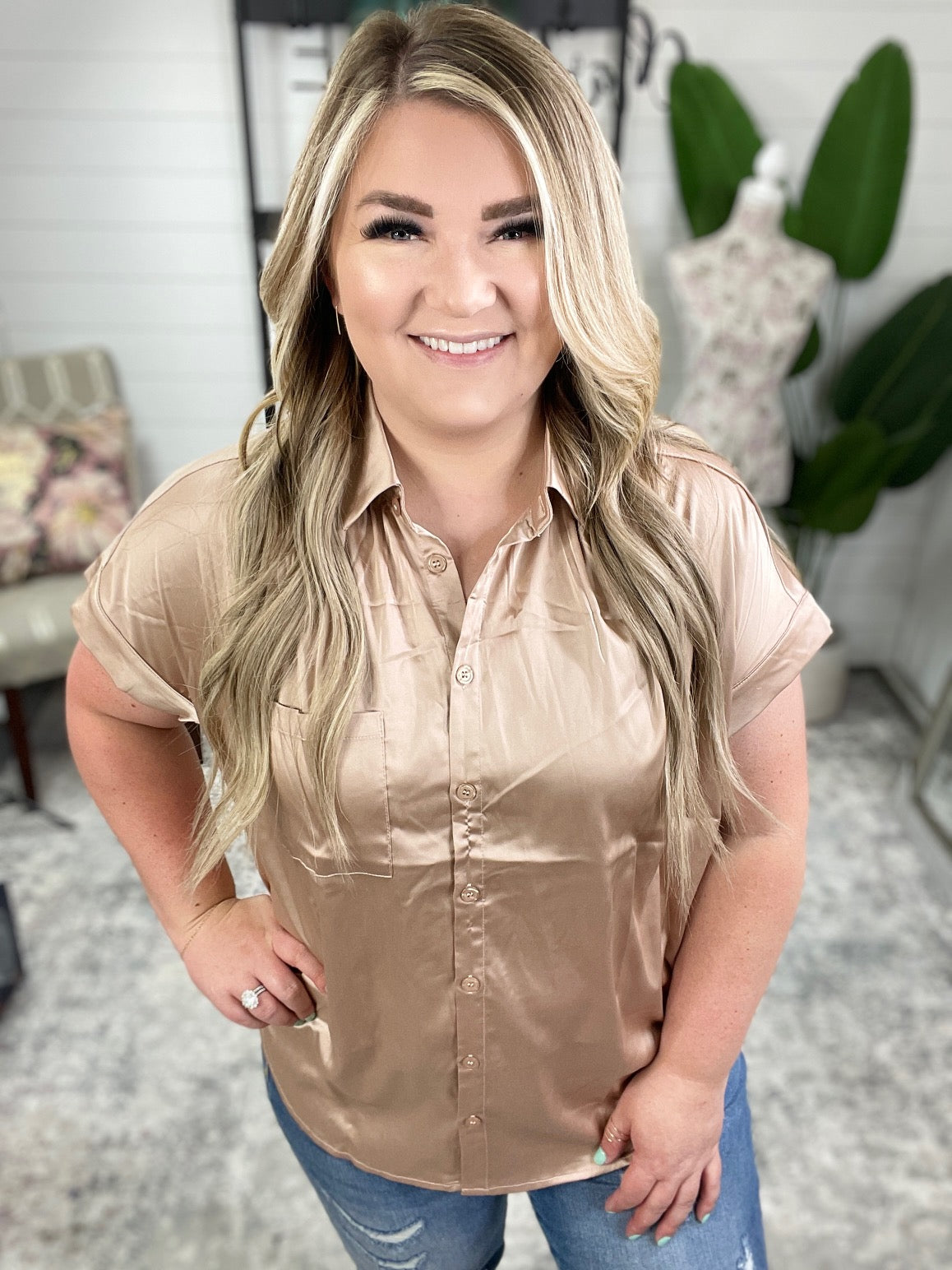 Never Have I Ever Button Down Blouse in Champagne