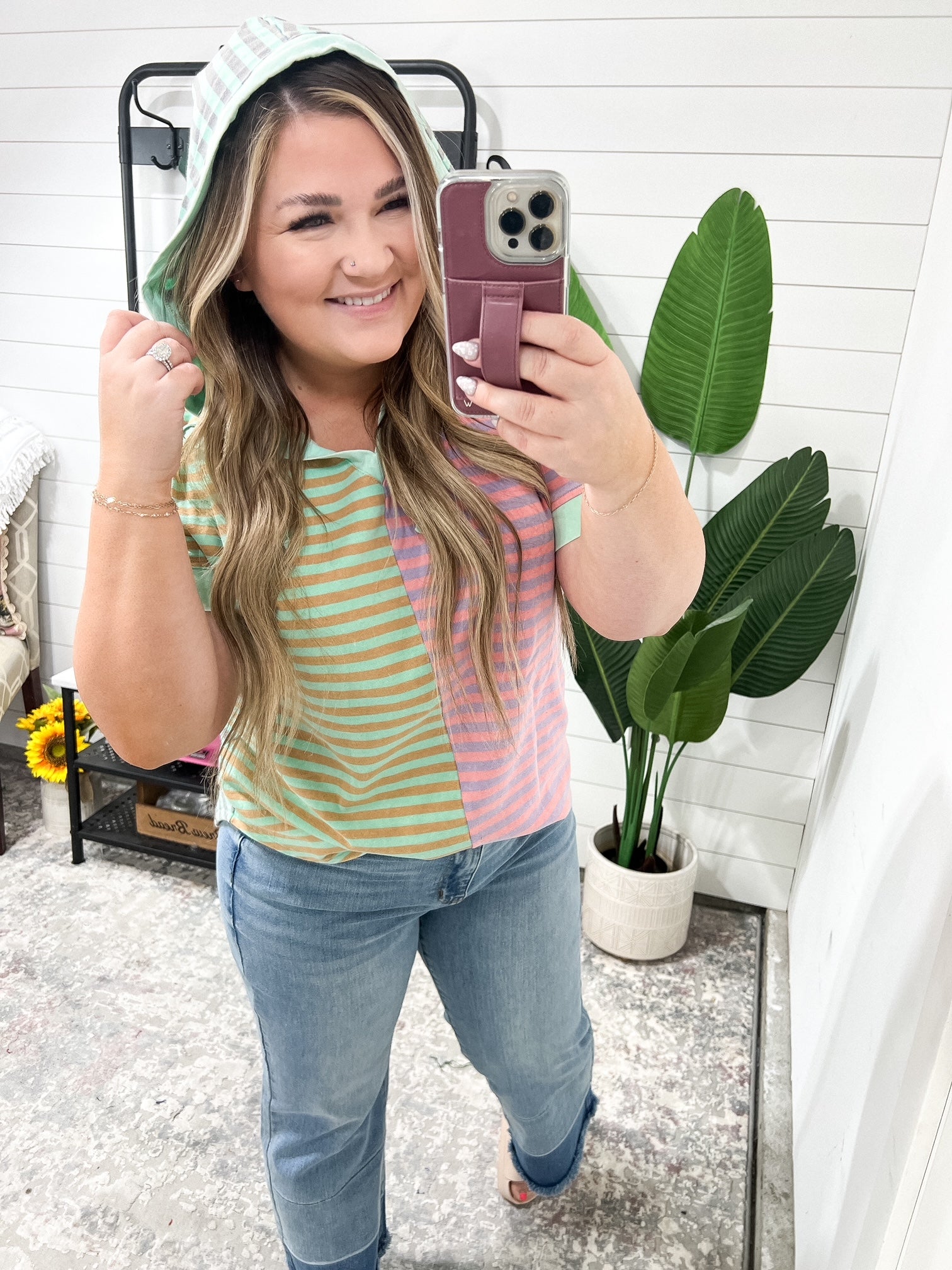Elevate your style with our New Light Color Block Striped Hoodie. Made with soft French Terri fabric for ultimate comfort. Show off your fashion forward and unique taste with a banded v-neckline, hood, drawstrings, and high-low scooped hem. Make a statement with this must-have piece!