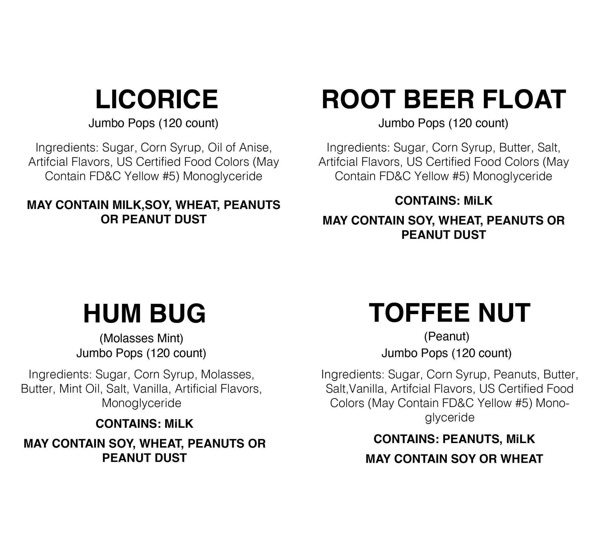 This 12 pack assortment of old time favorite flavors includes 3 Licorice Jumbo Pops, 3 Root Beer Jumbo pops, 3 Humbug Jumbo Pops, and 3 Toffee Nut Jumbo Pops.
