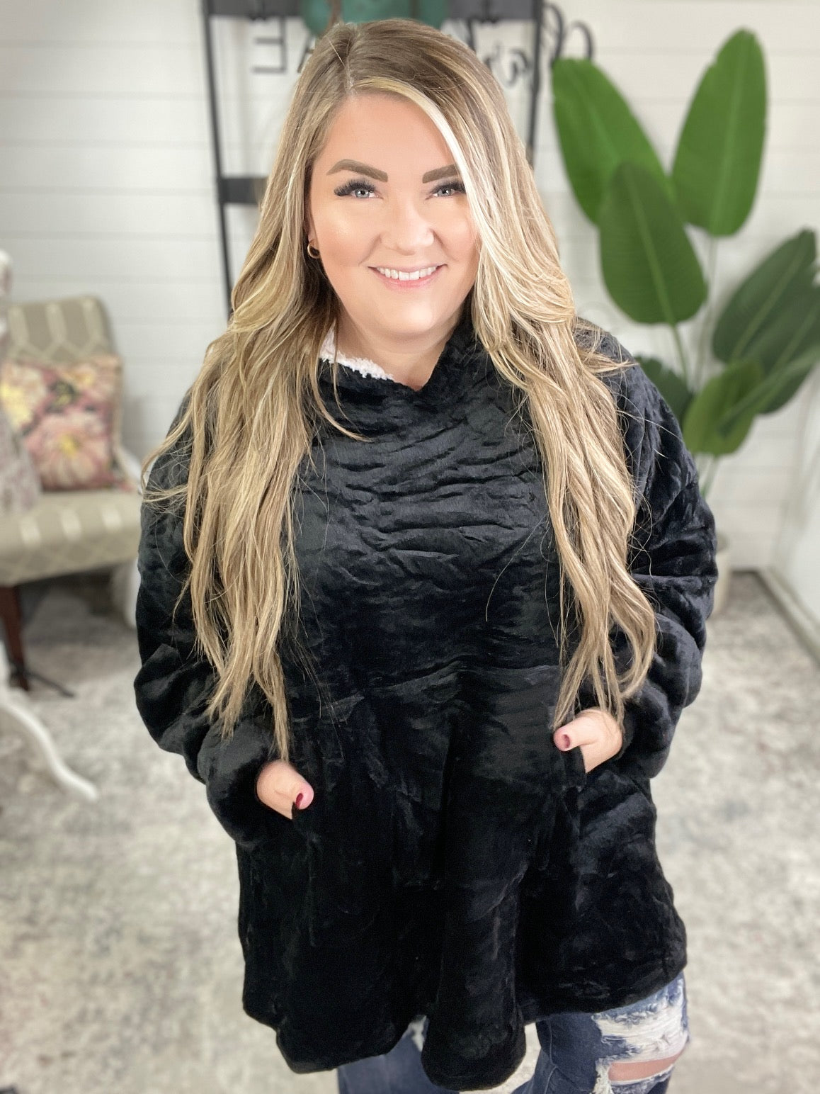 Wrap yourself in comfort and style with this Oversized Velour Blanket Hoodie! Featuring a luxuriously soft sherpa lining, spacious kangaroo pocket and hood, it's a cozy and fashionable addition to your wardrobe. Enjoy the oversized fit and the feeling of being enveloped in warmth and relaxation.