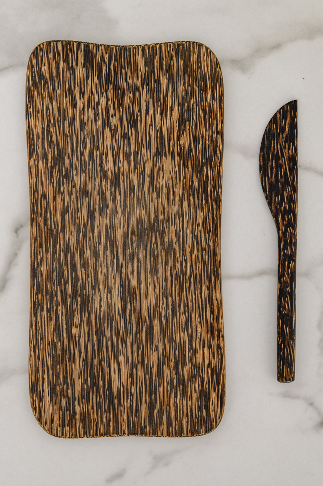 Sustainably sourced and naturally patterned, this palm wood board and spreading knife creates a beautiful background for compound butter and goat cheese. Make your snack spread as beautiful as it is delicious, or take this along to your next party as a host gift.