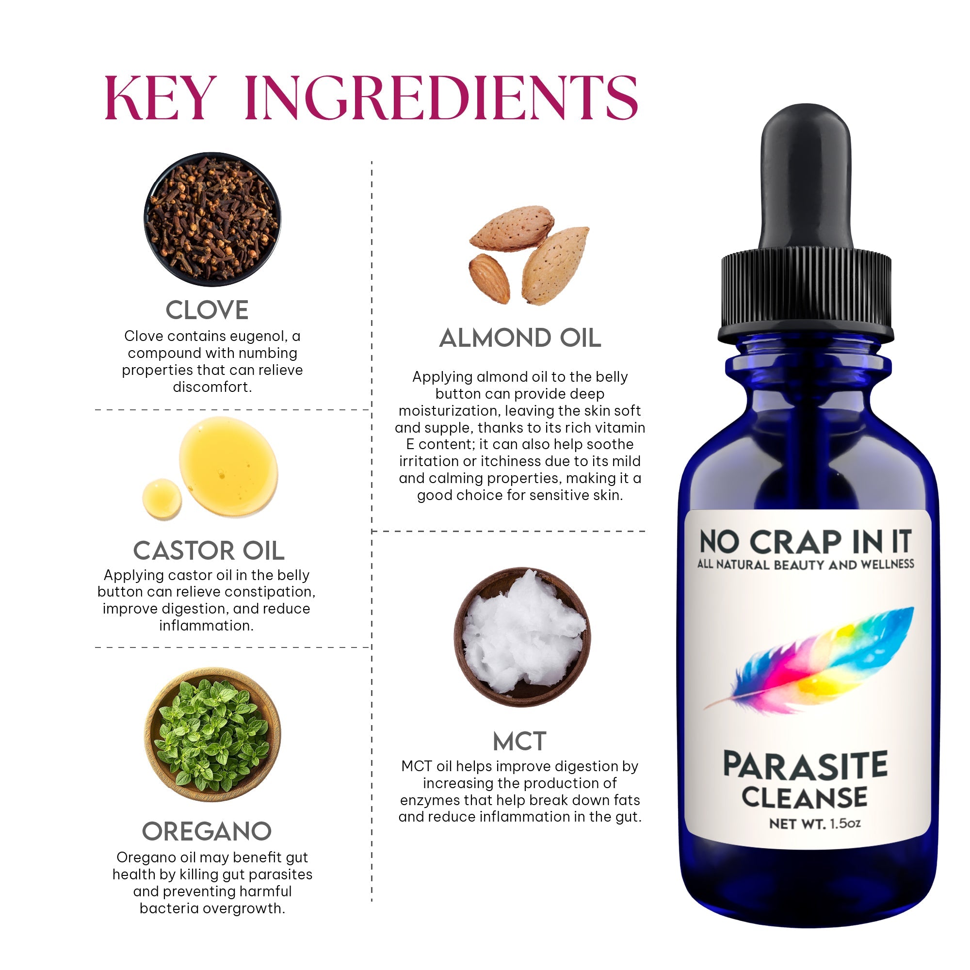 Castor Oil, Almond Oil, MCT Oil, Clove, Oregano