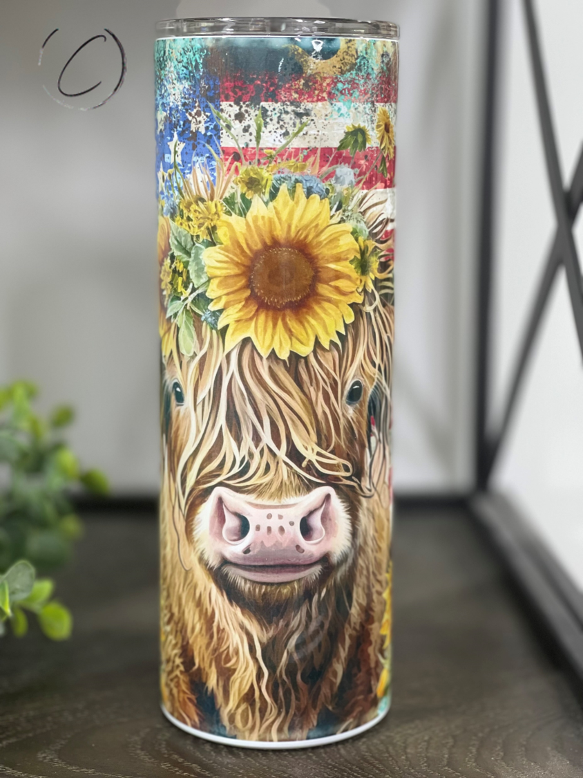 Patriotic Sunflower Highland Cow 20oz Skinny Tumbler