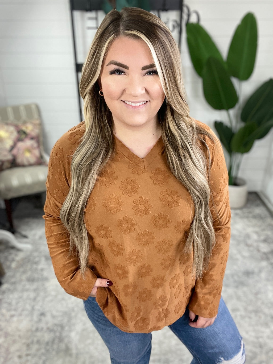 Our Perfect in Pansies V-Neck Top is the perfect way to add a subtle pop of fun to your wardrobe. The textured burnout floral pattern is on a stretchy knit fabrication, making it comfortable and stylish. With long sleeves, this top is a perfect choice for the modern woman.