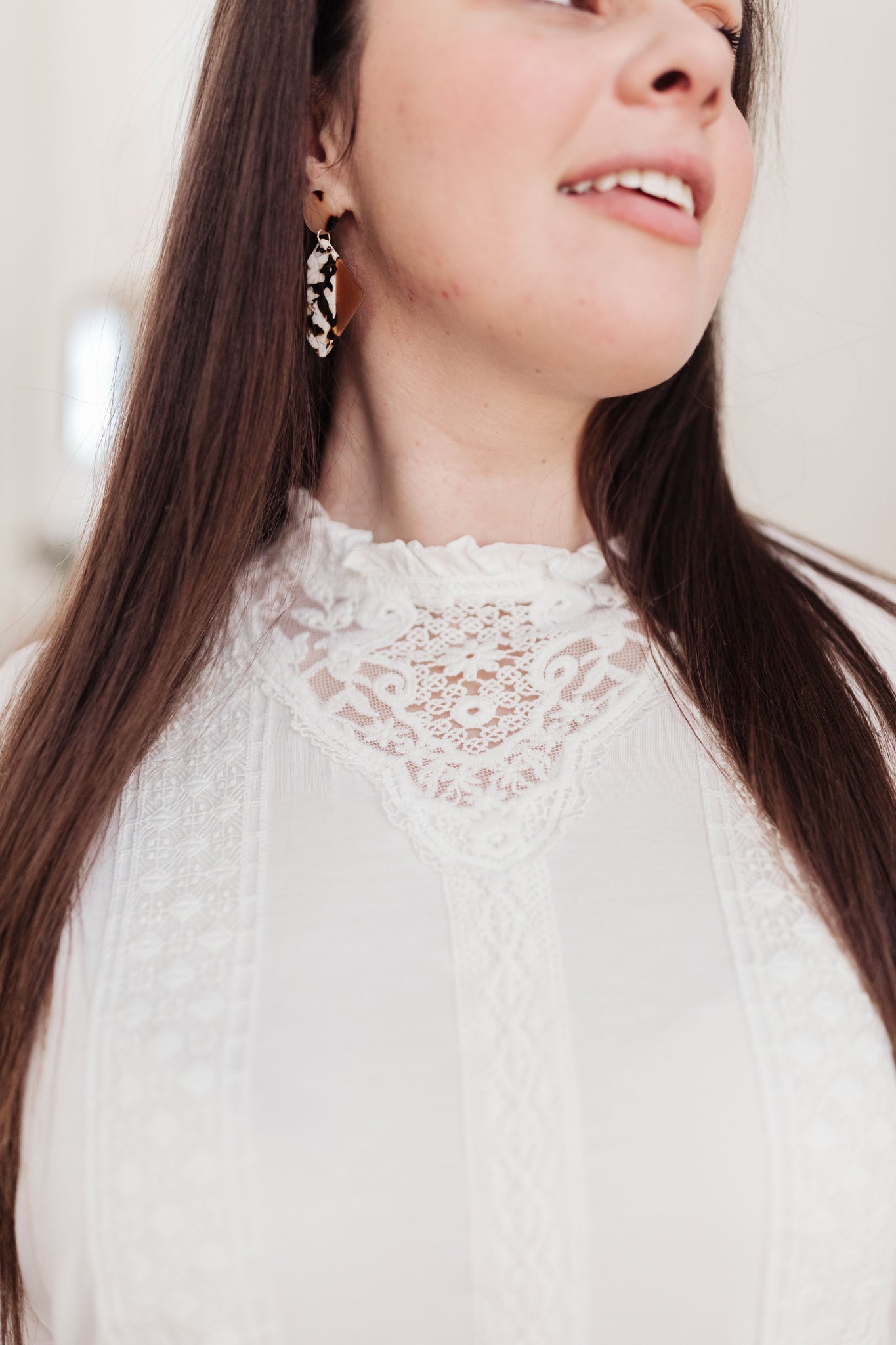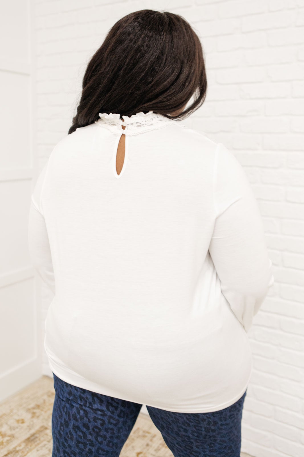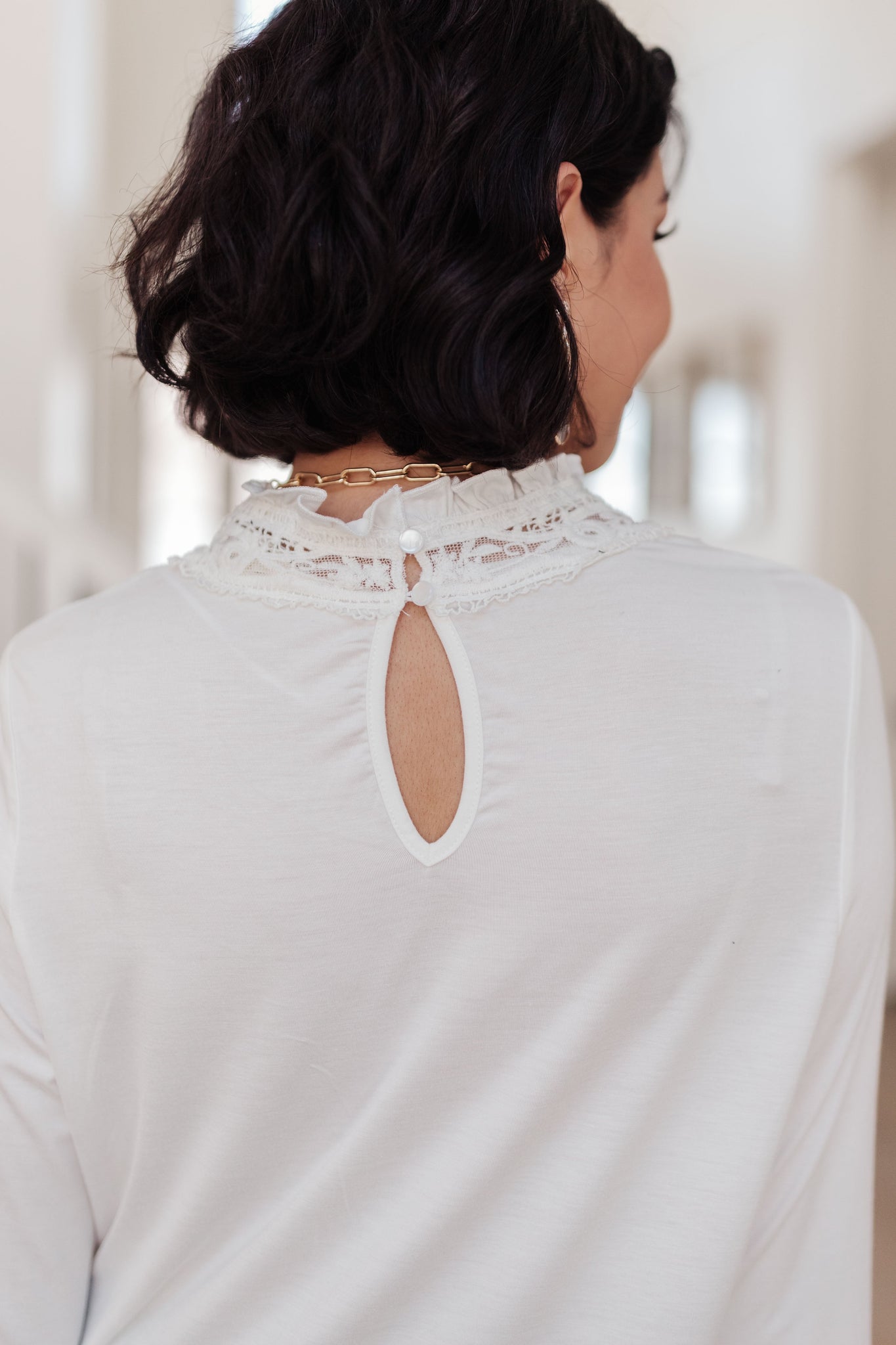 Keywords: White Top, Ruffle, Lace, Crochet, Mockneck
