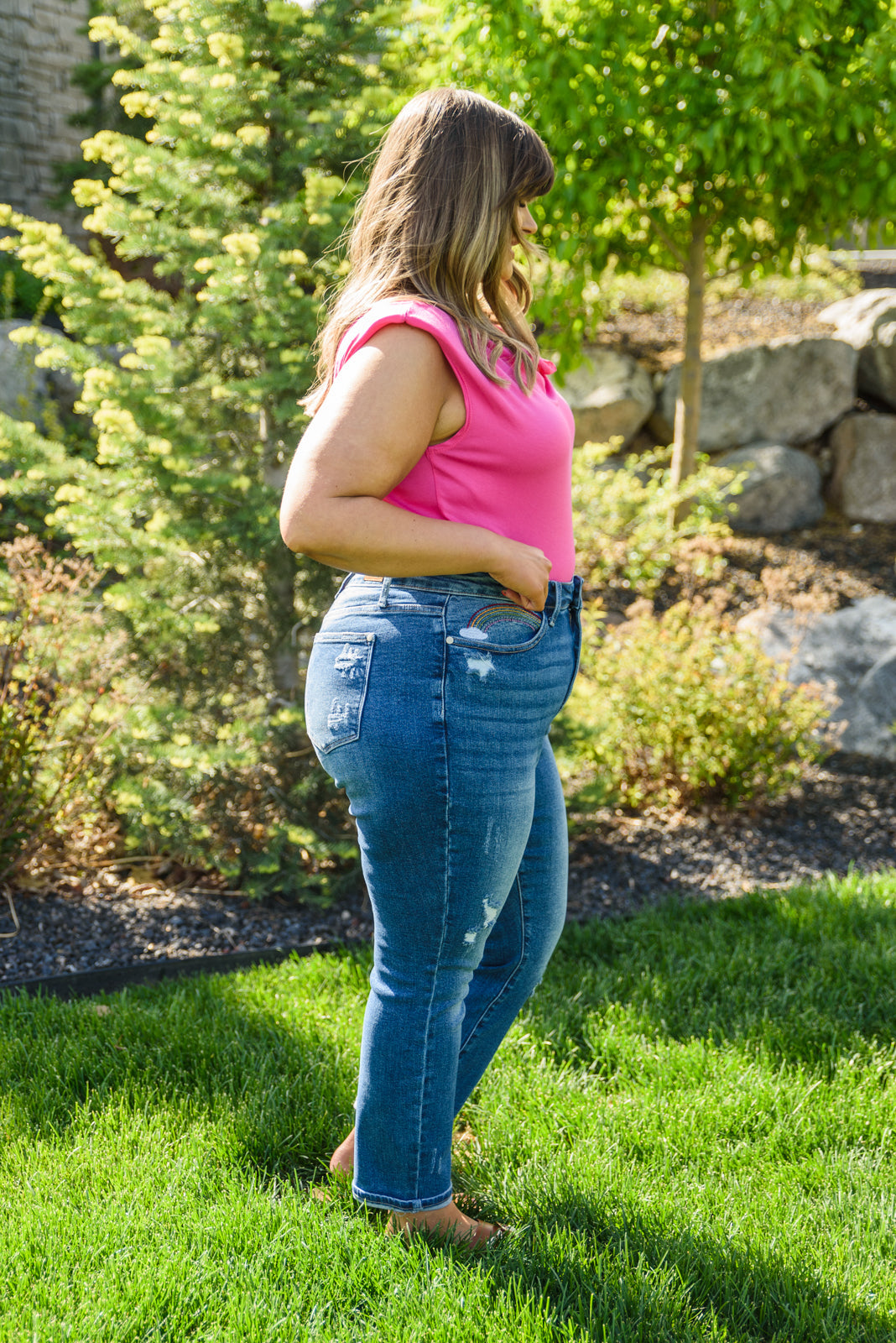 • Hi-Rise Rainbow Embroidery Cropped Straight Leg Jeans