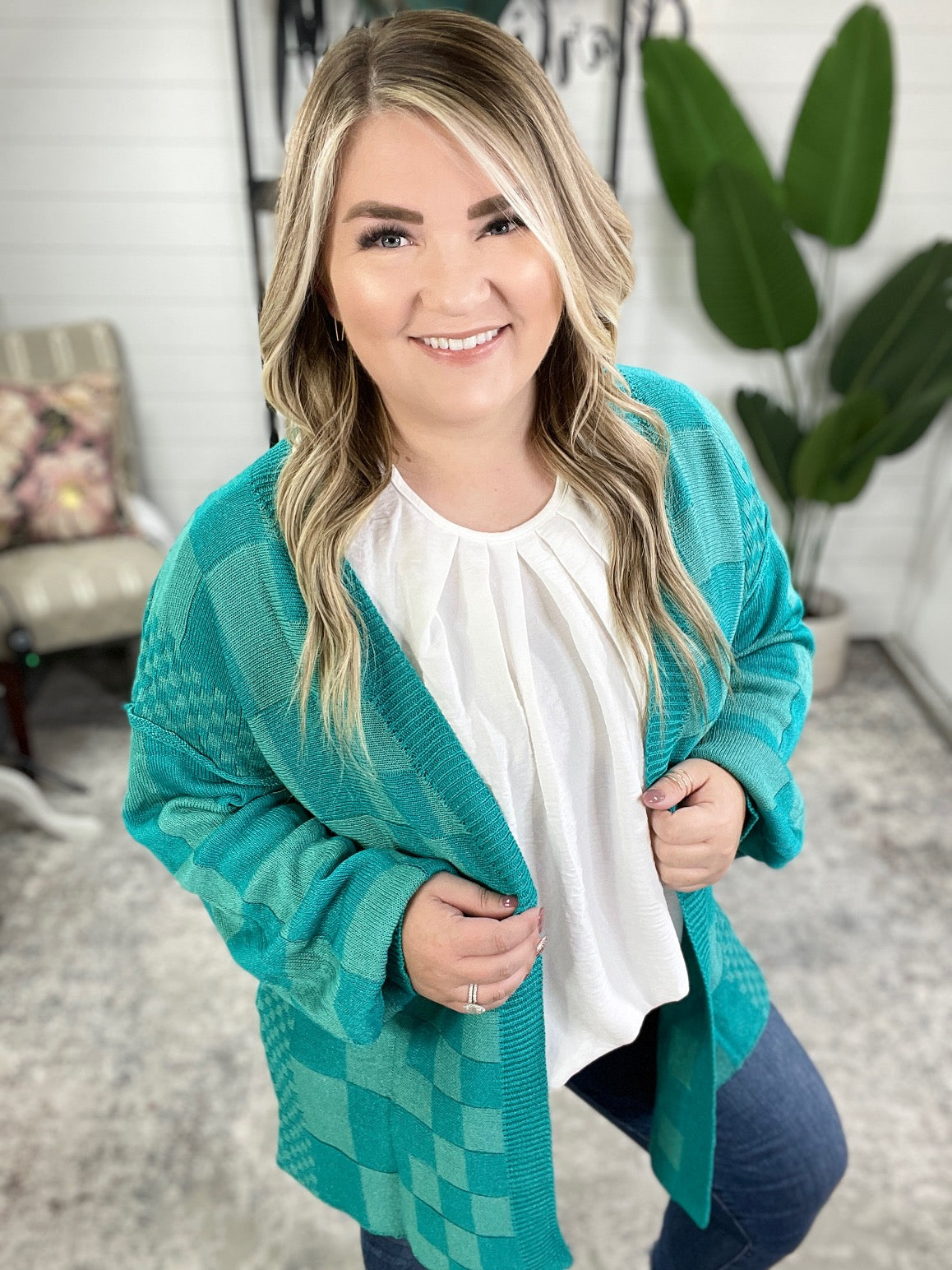 Introducing the Pinky Swear Checkered Open Front Cardigan! Be daring and flaunt your style with this unique monochrome checkered pattern and a relaxed fit. This piece is sure to be the perfect fun layer you've been looking for!