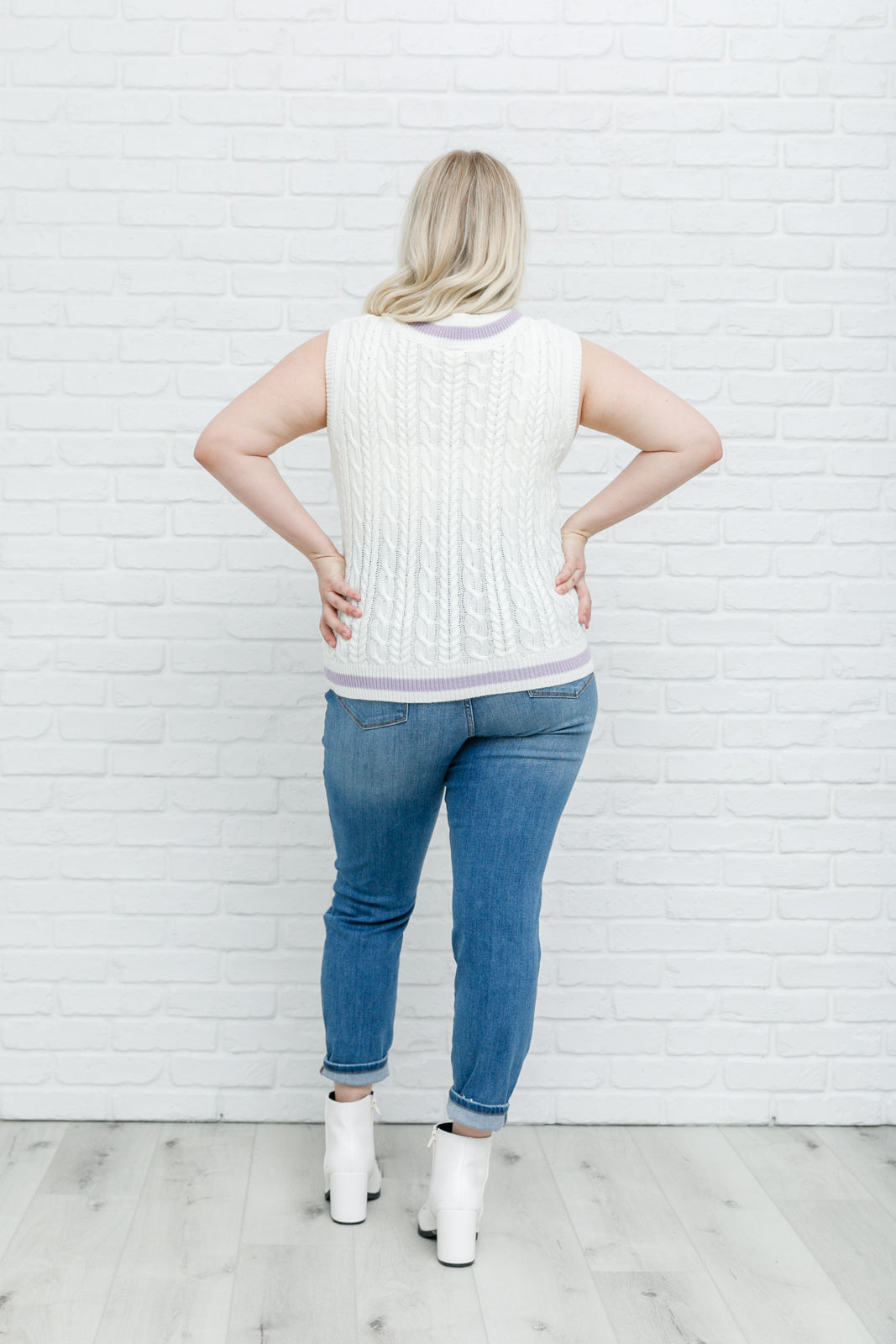 The Power Girl Sweater Vest is exactly what you need to transition into spring. A cable knit shapes a v neckline, sleeveless cut, and front patch pocket, where the hem, pocket, and neckline are lined in a pastel purple. We love this layered with a button up, or simple tee underneath, white skinnies, and loafers! We are certain this will become one of your fav tops this season!