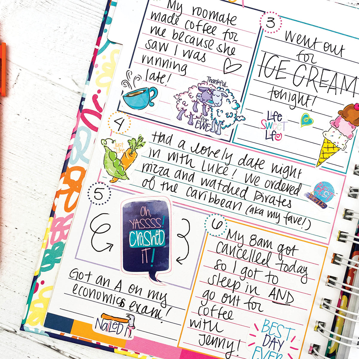 Colorful, heartwarming, spirit-lifting stickers with sayings like Best Day Ever, Nailed It, My Happy Place and Life is Amazing Decorate your journal, notebook or planner with these whimsy images of donuts, pineapples, coffee and flamingos, too!