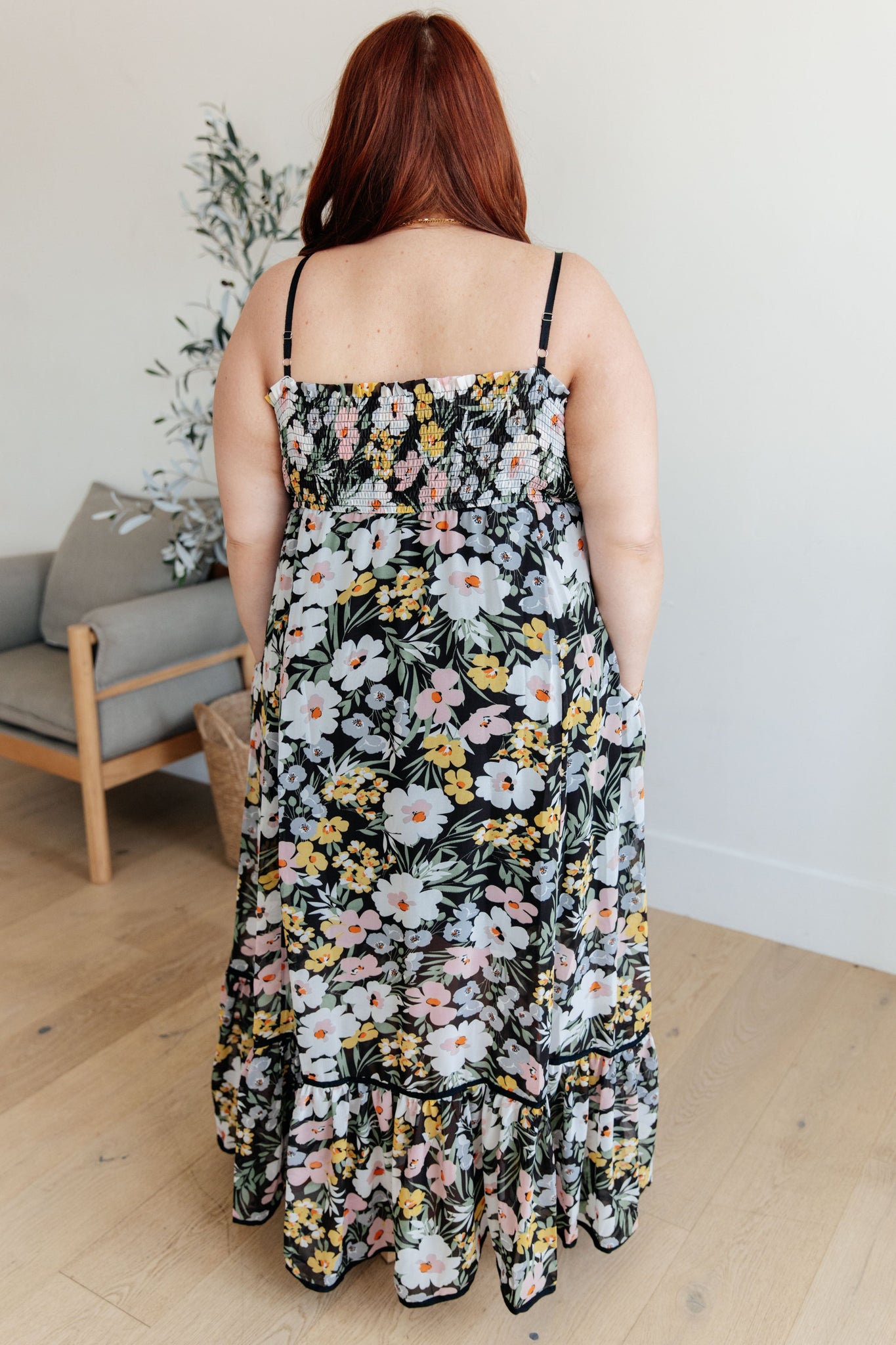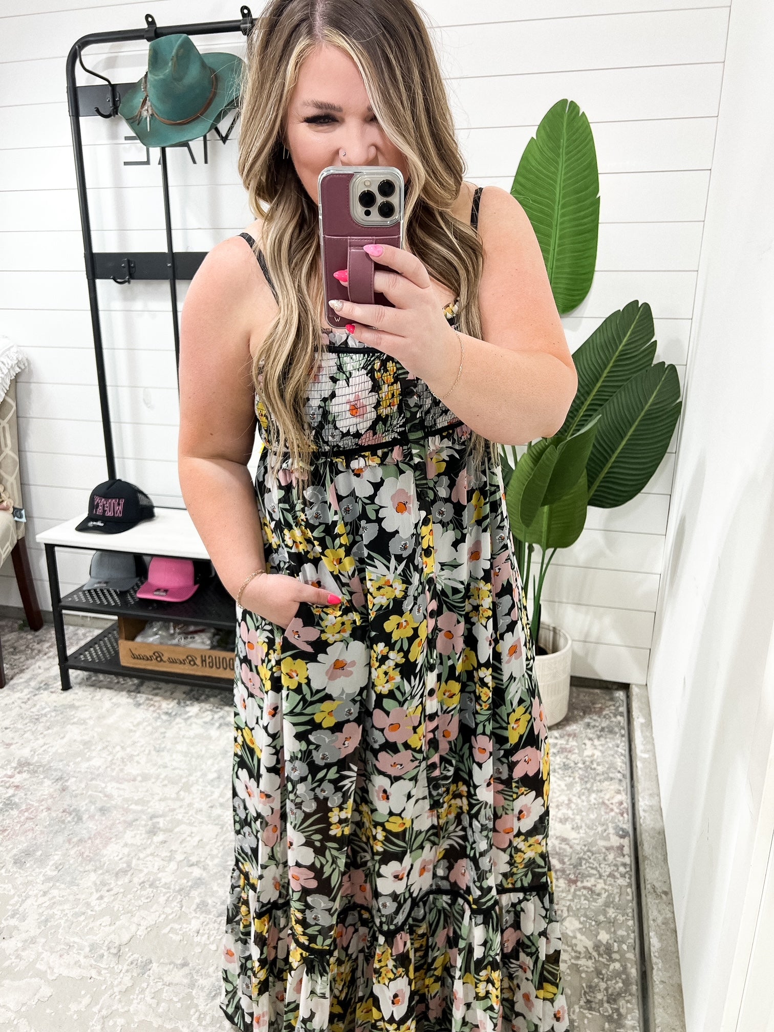 Rise like a Phoenix in our Floral Maxi Dress. With raw edge details and a smocked bodice, this fully lined dress is both stylish and comfortable. Faux buttons add a touch of charm while adjustable straps and a tiered ruffle skirt provide dimension. You'll feel born again!